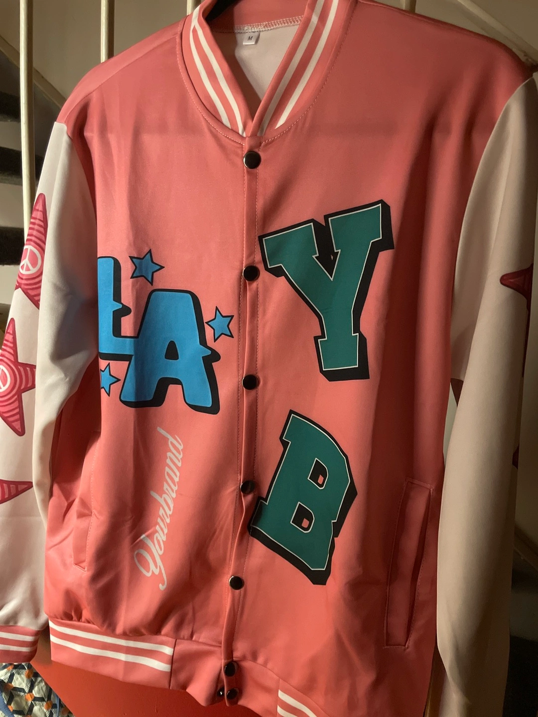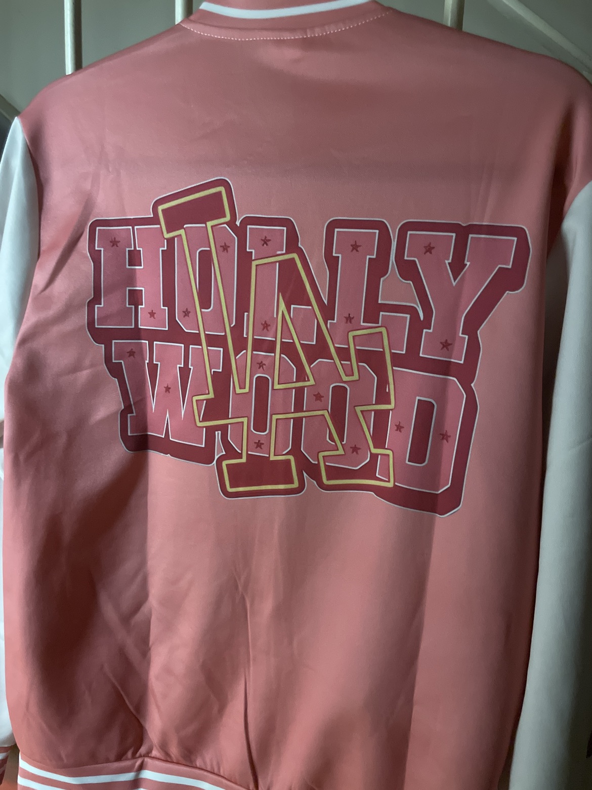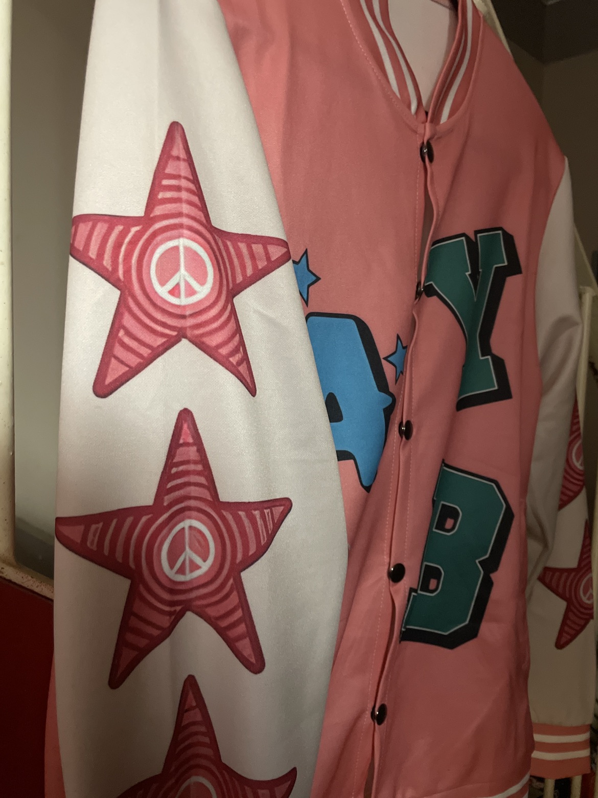 Unique varsity-style jacket. Features a salmon-pink body with colourful lettering and peace sign star designs on the sleeves. Hollywood LA font on the back. Button-up closure. BRAND NEW! Never been worn.