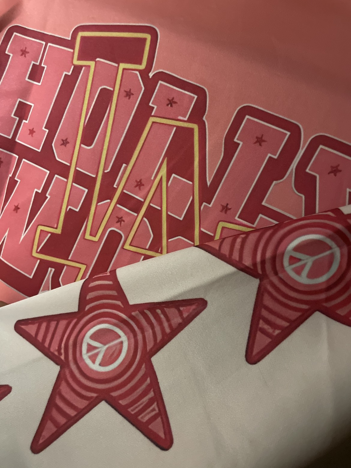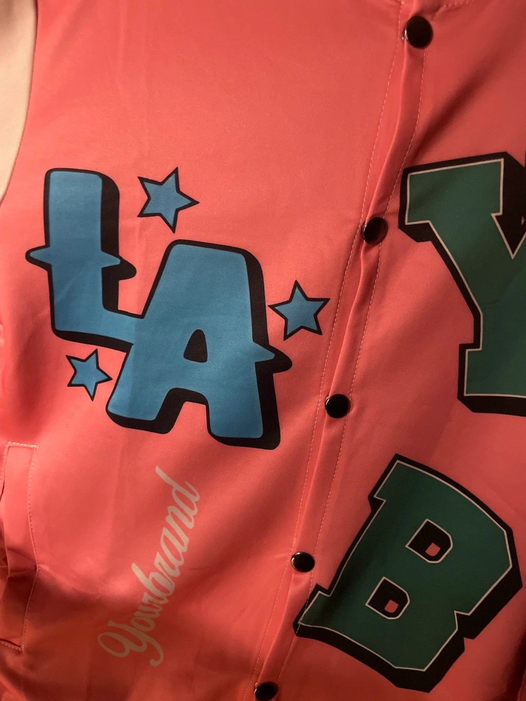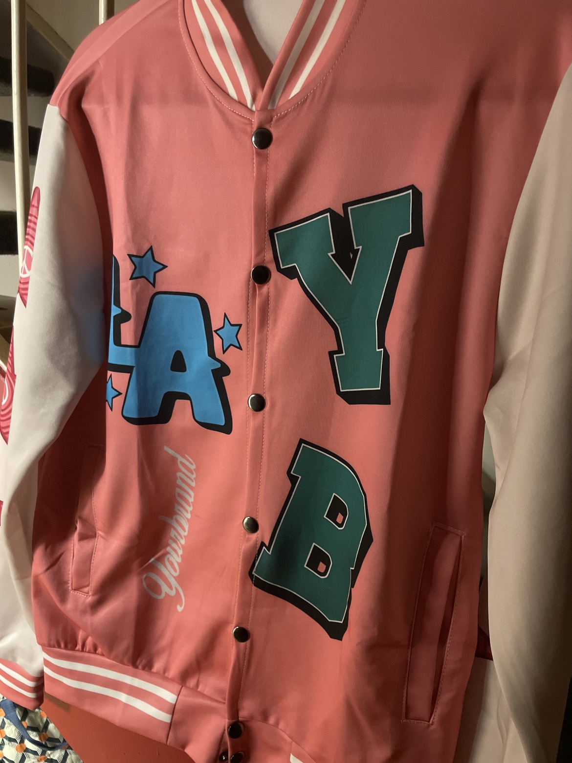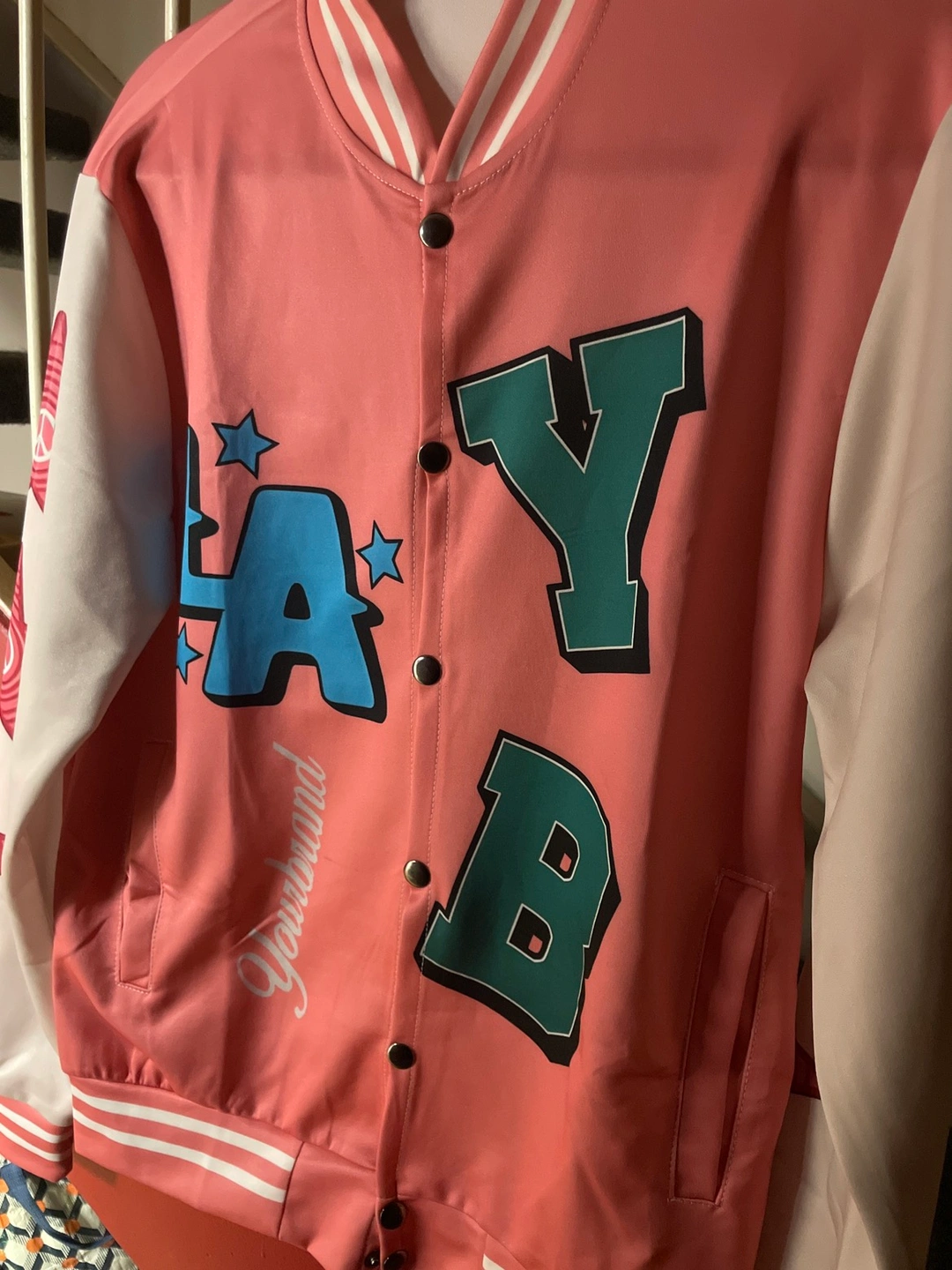 Unique varsity-style jacket. Features a salmon-pink body with colourful lettering and peace sign star designs on the sleeves. Hollywood LA font on the back. Button-up closure. BRAND NEW! Never been worn.
