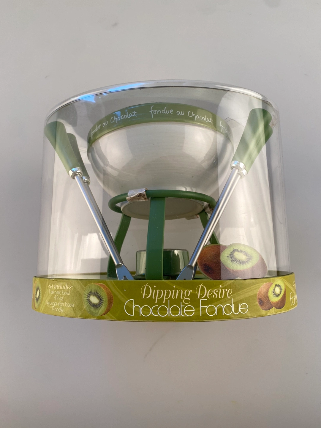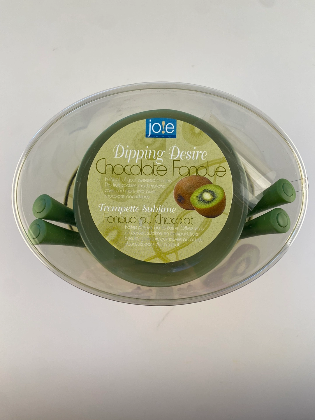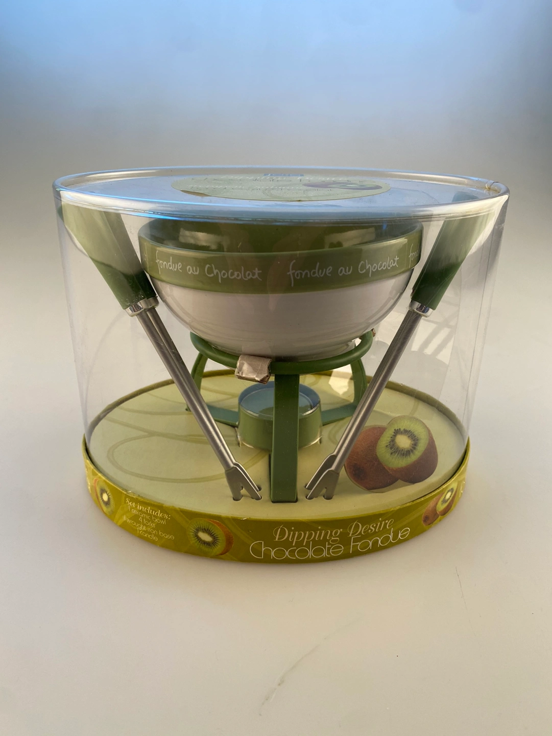 This cute little green & white chocolate fondue set comes with 4 fondue forks and a candle in the base. New in packaging. Made by Jo!e. Makes a sweet hostess gift.