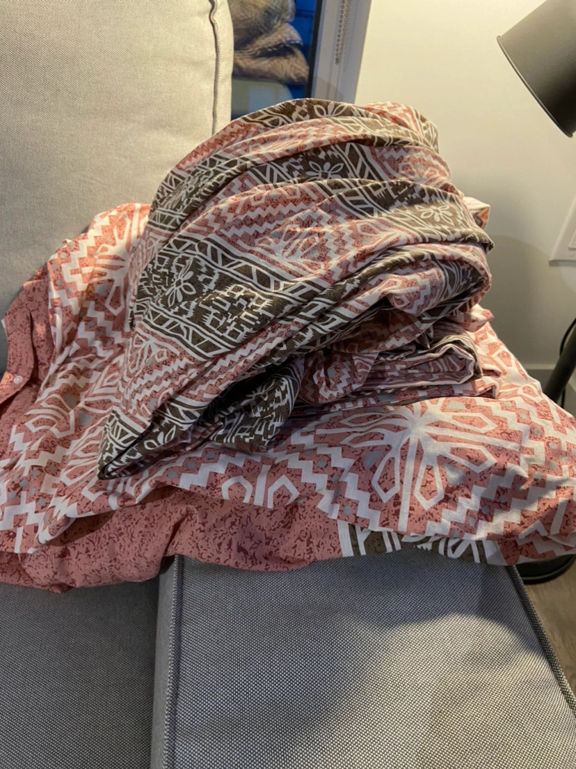 Complete bed linen set full/queen size, with fitted bed sheet, duvet cover, and four pillow covers. Used only once before. Not a fan of the pattern so giving away. #freecycle