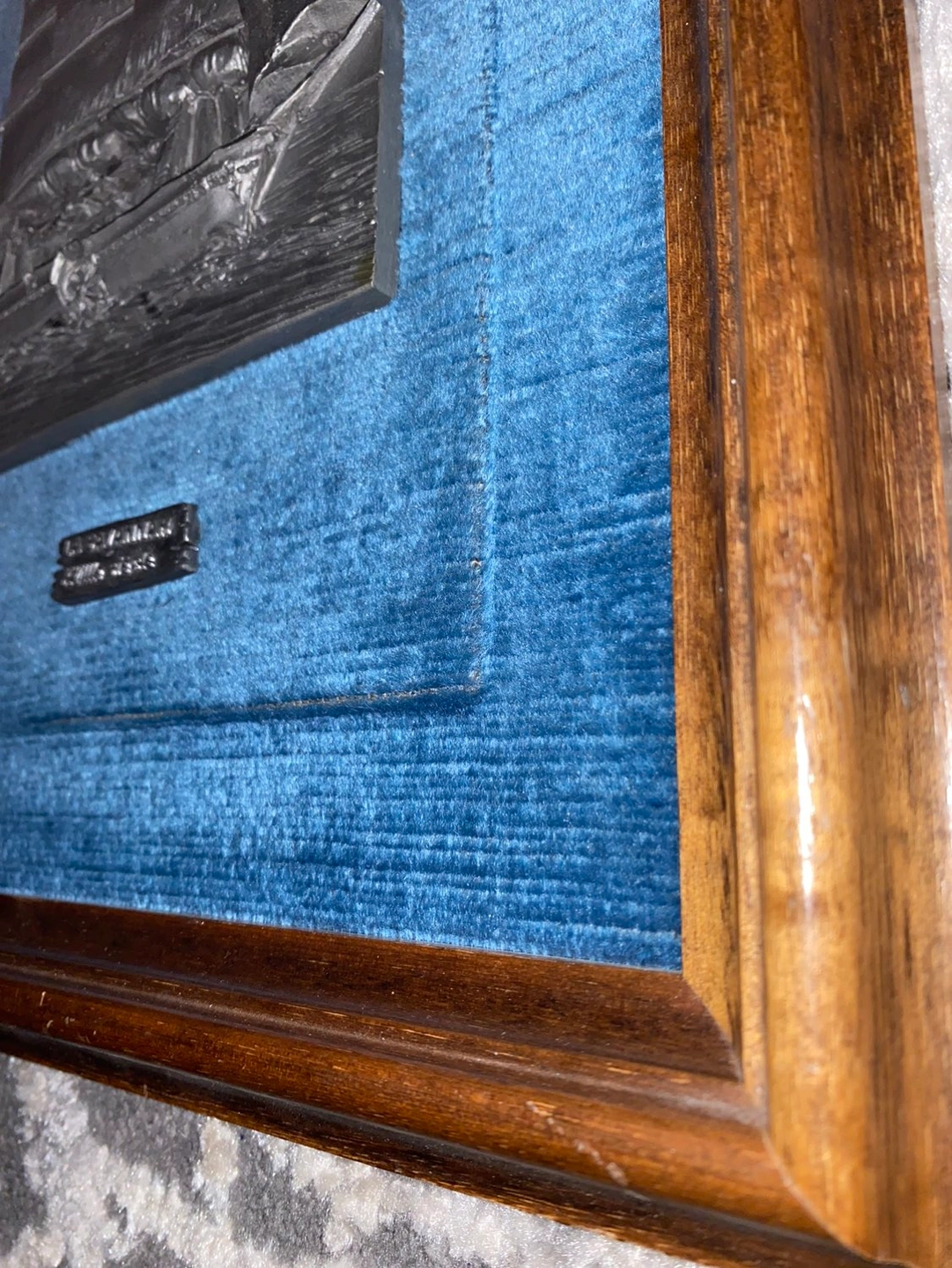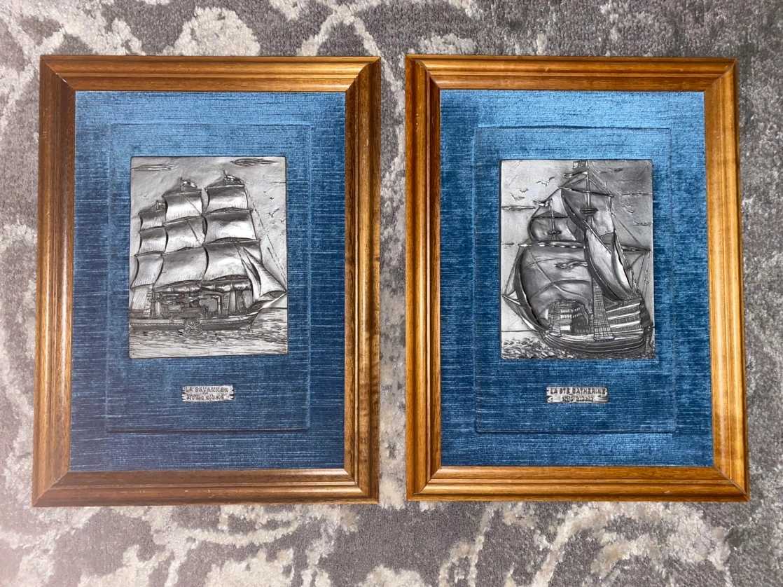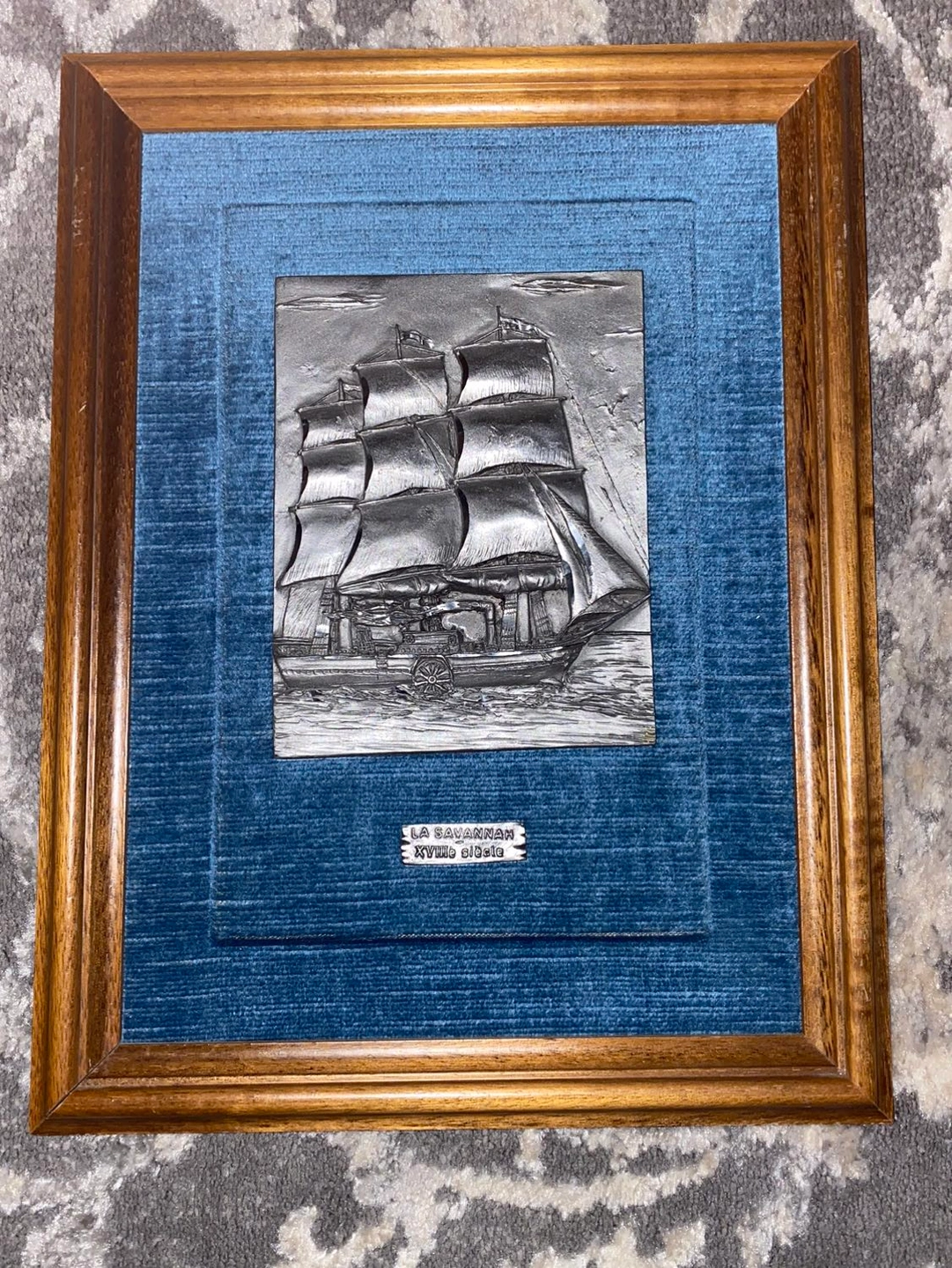 Unique set of 2 framed pewter sailboats with turquoise velvet background.