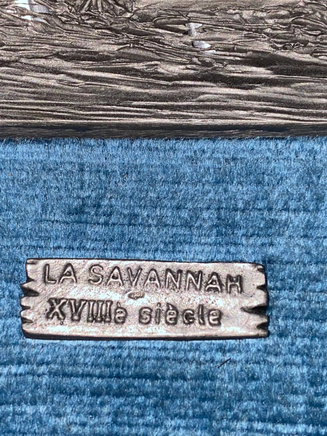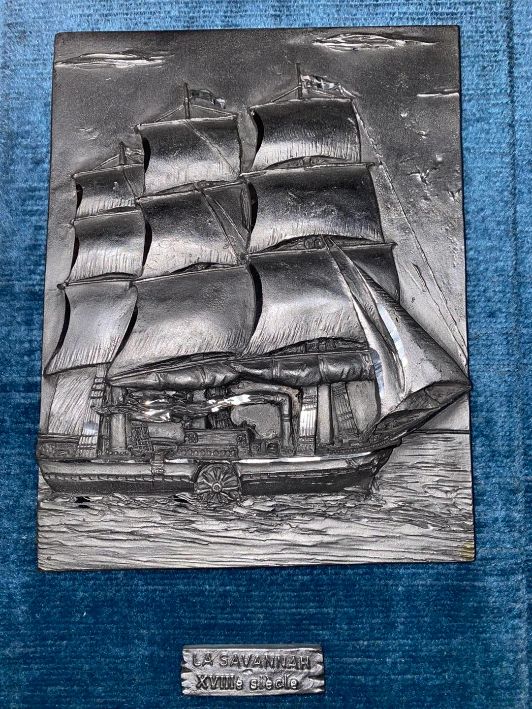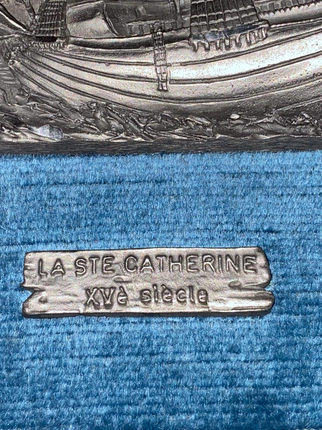 Unique set of 2 framed pewter sailboats with turquoise velvet background.