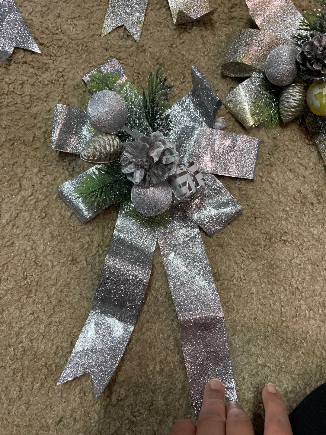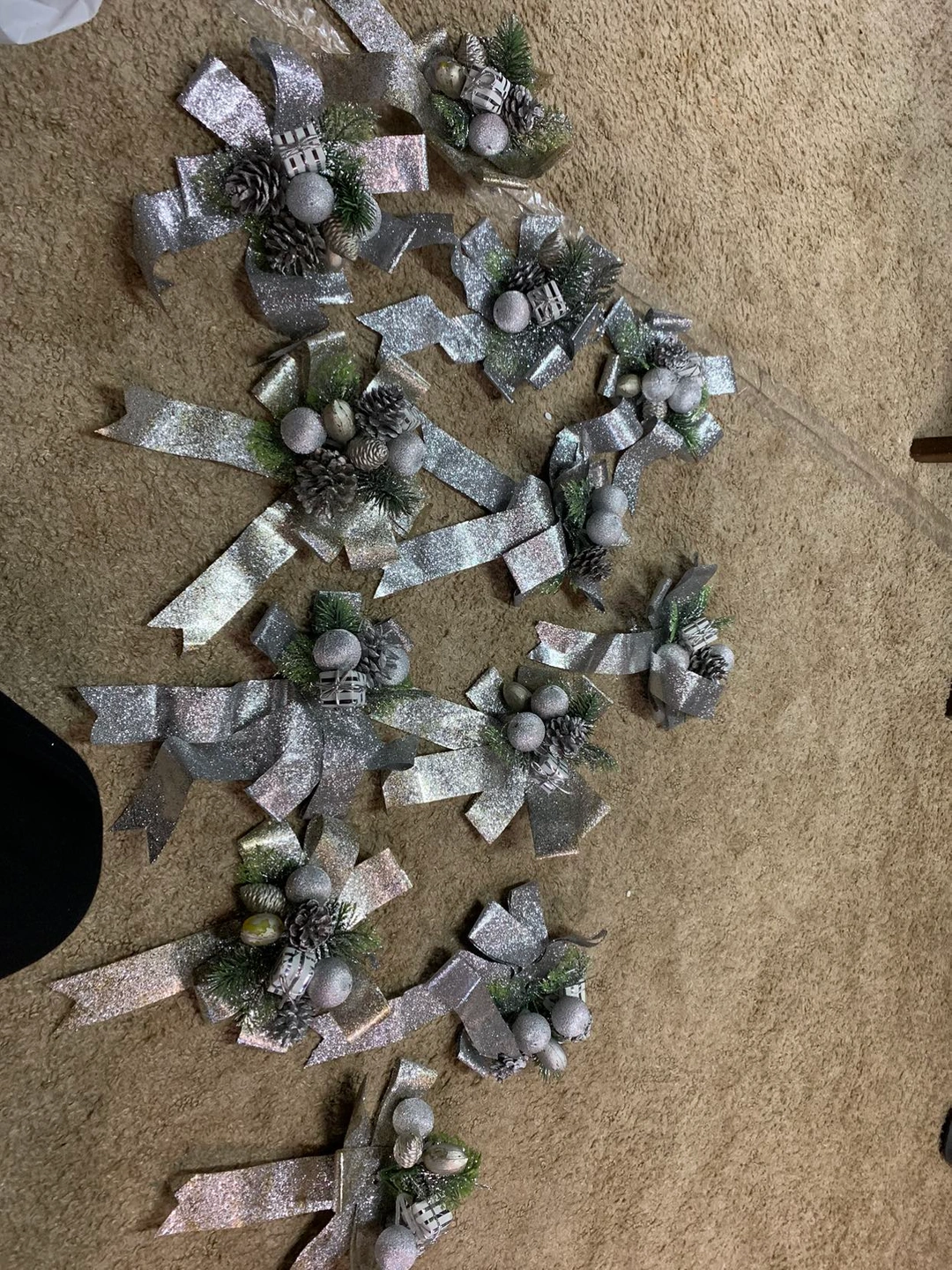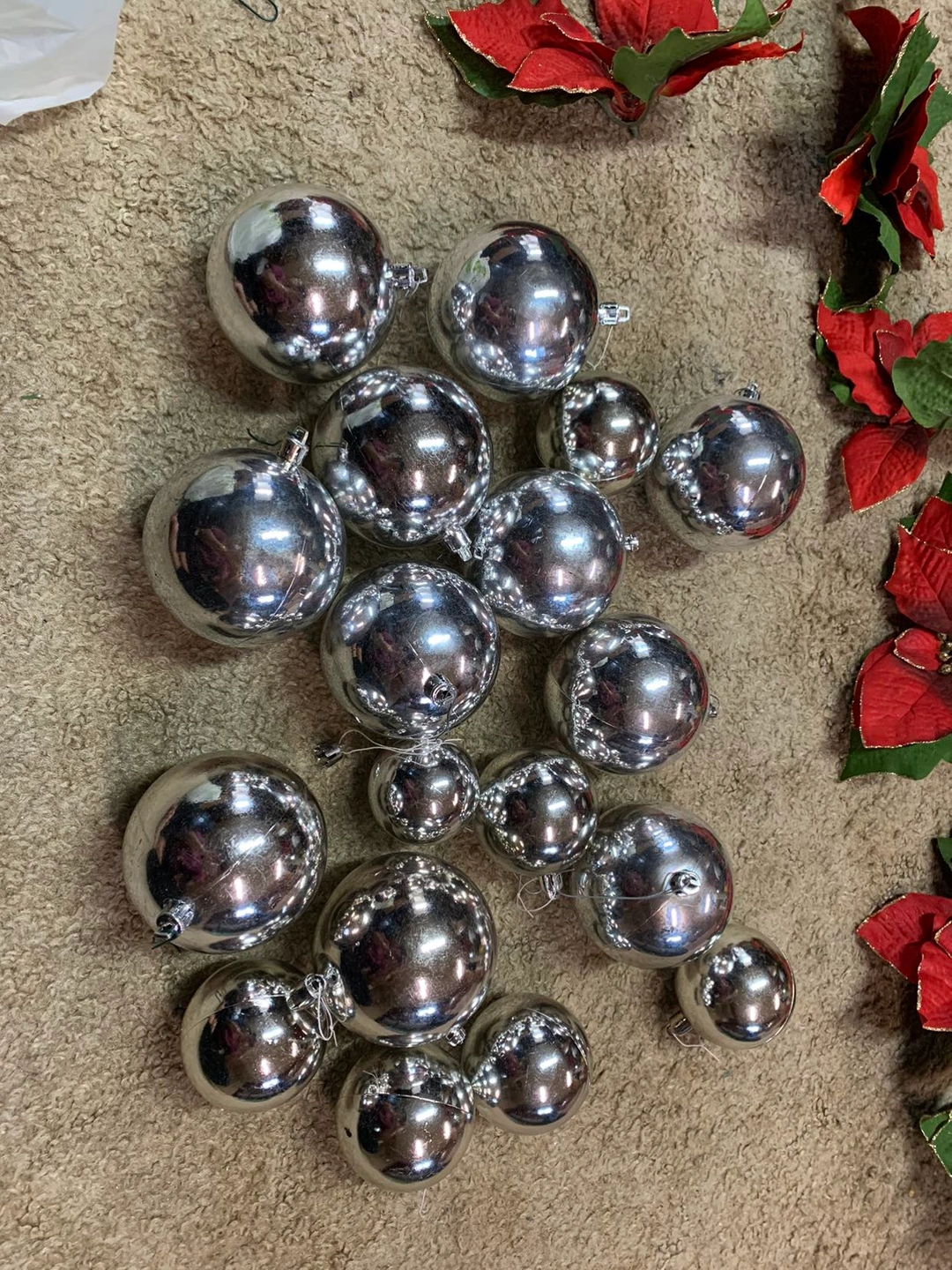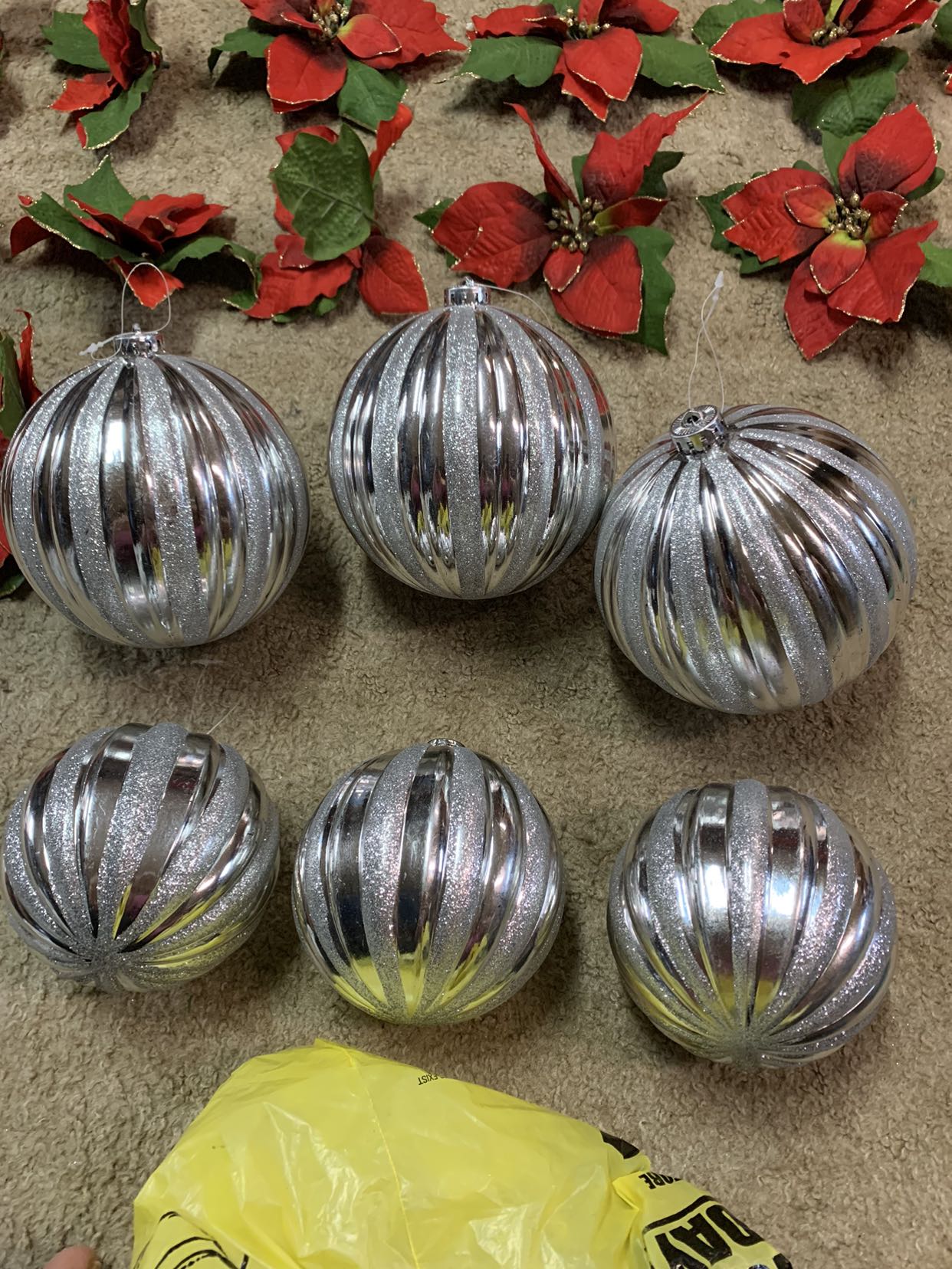 Christmas tree decorations ornaments Lots of things included together Santa clause statue with lights about 30cm tall, Poinsettia flowers high quality about 30 pieces 5-6” each, silver bows, red bows, pine cones, silver big ornaments about 6-7” each, silver small ornaments about 2-3” each, tree topper star about 8-10” big, one string light as well All for $30 obo Pet free smoke free home Pickup near Scarborough town centre