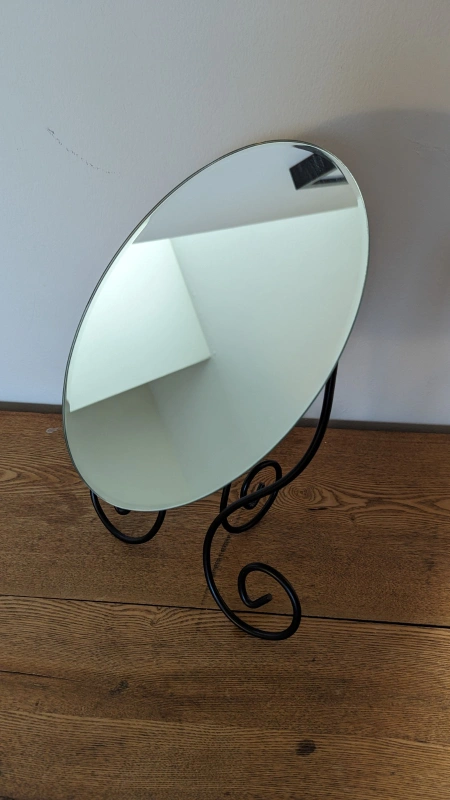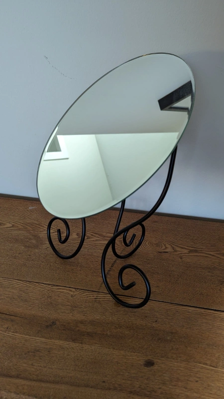 Ikea table mirror. The mirror has an adjustable angle and can even fold flat if needed.