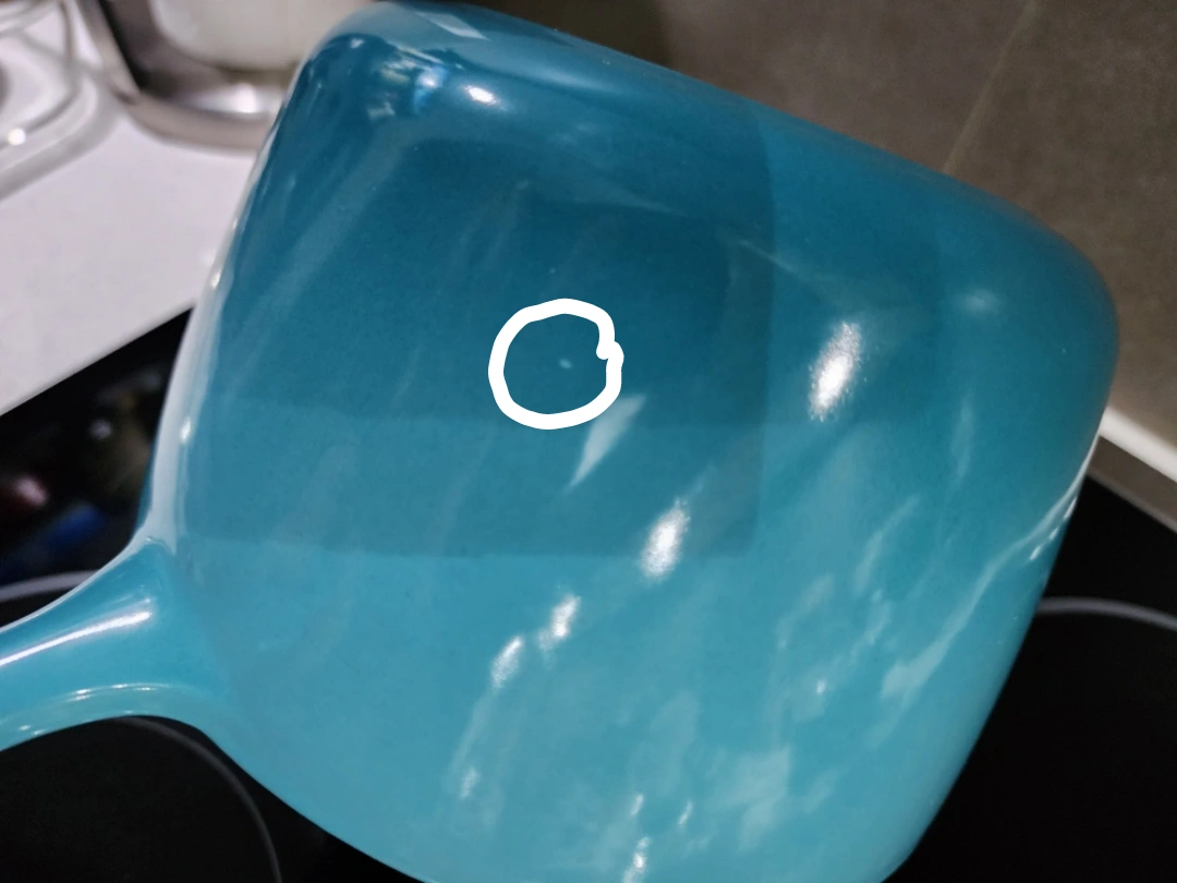 Exterior wall has two tinny tiny flaws. One is discoloration and one is a pinhole chip, not noticable.