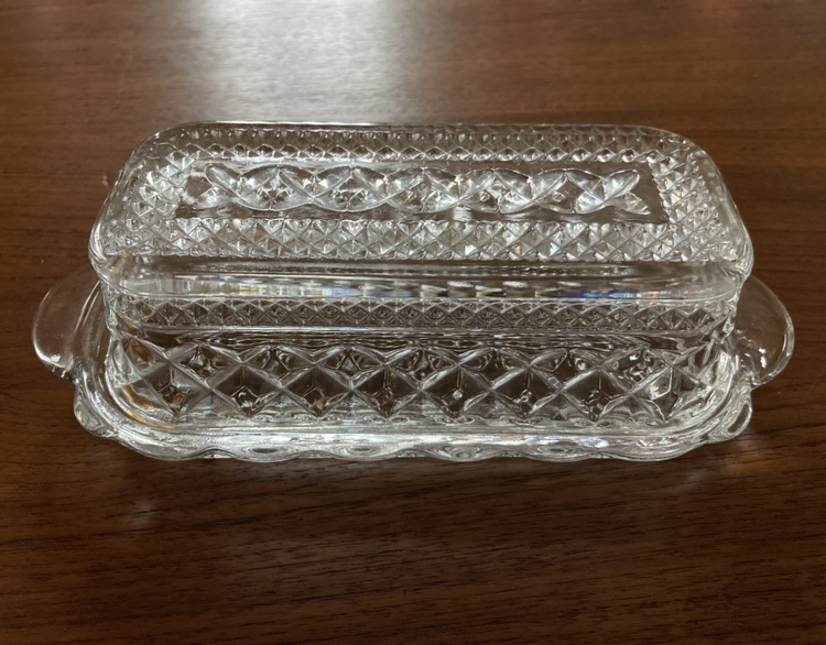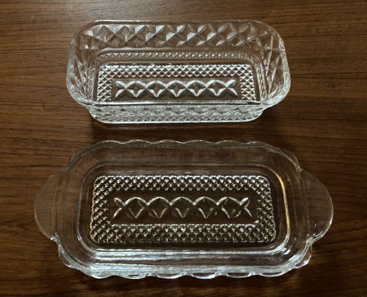 Vintage Anchor Hocking Wexford Clear Glass Butter Dish with Lid. Such a lovely piece that would jazz up any table. Great condition with both pieces fully intact. 2 1/2H × 3 1/2”W x 8”L