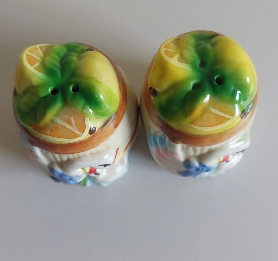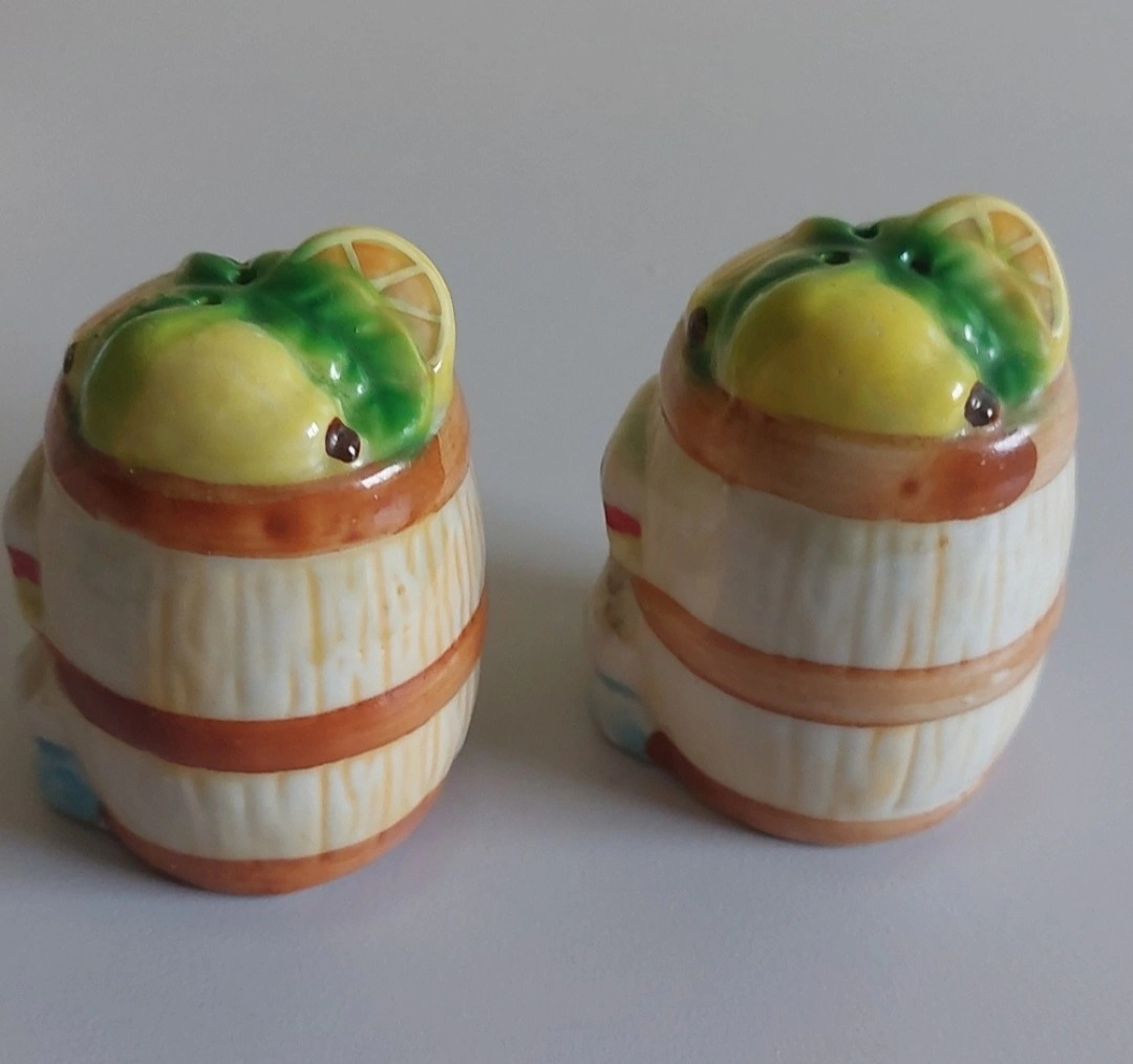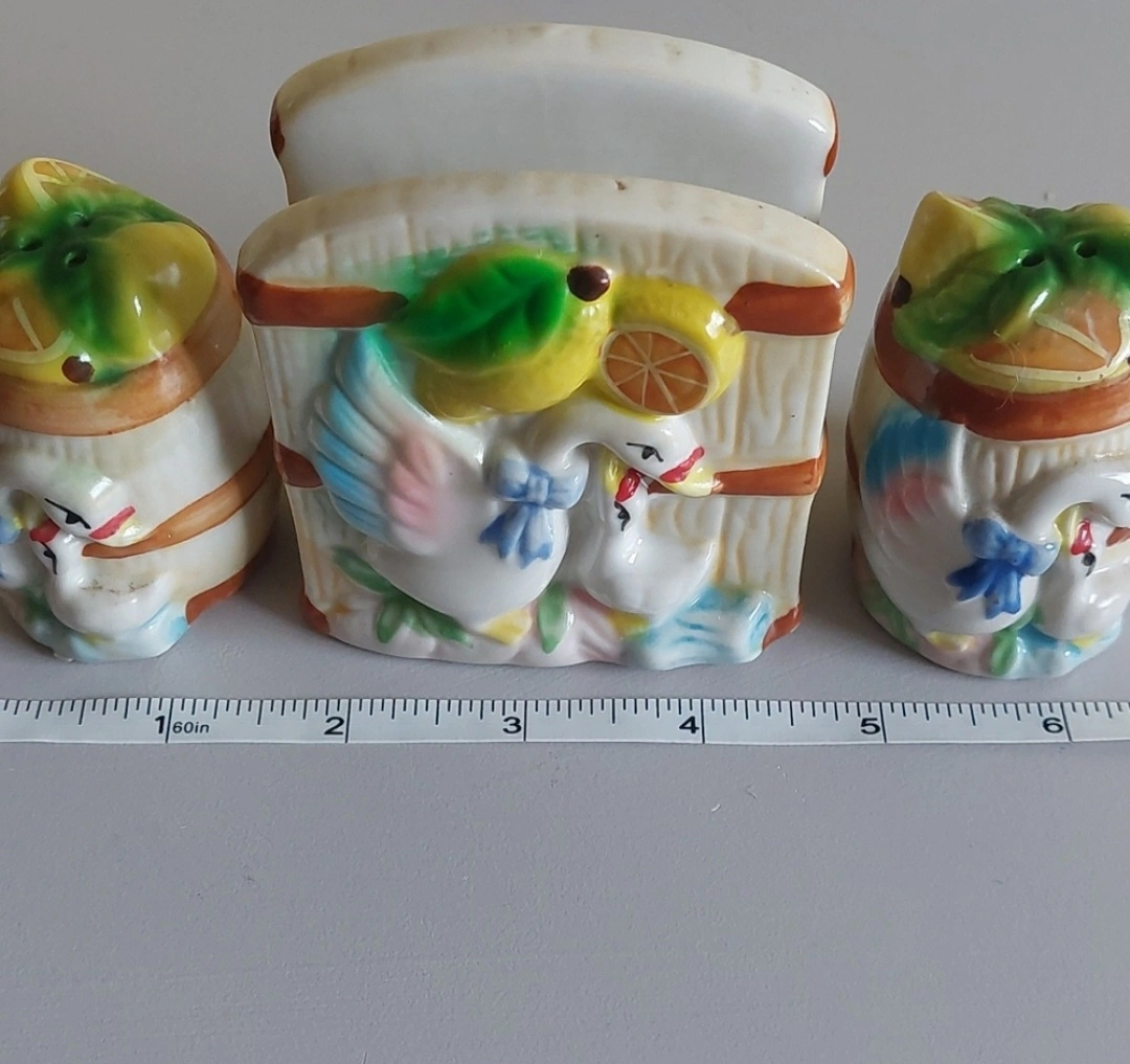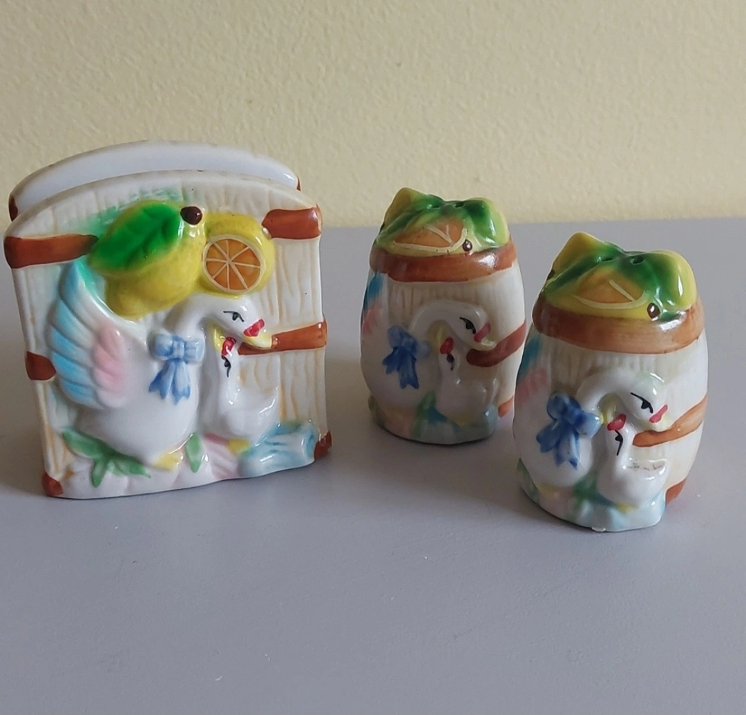 Sweet little set of salt and pepper shakers with matching napkin holder.