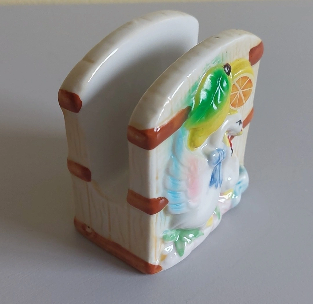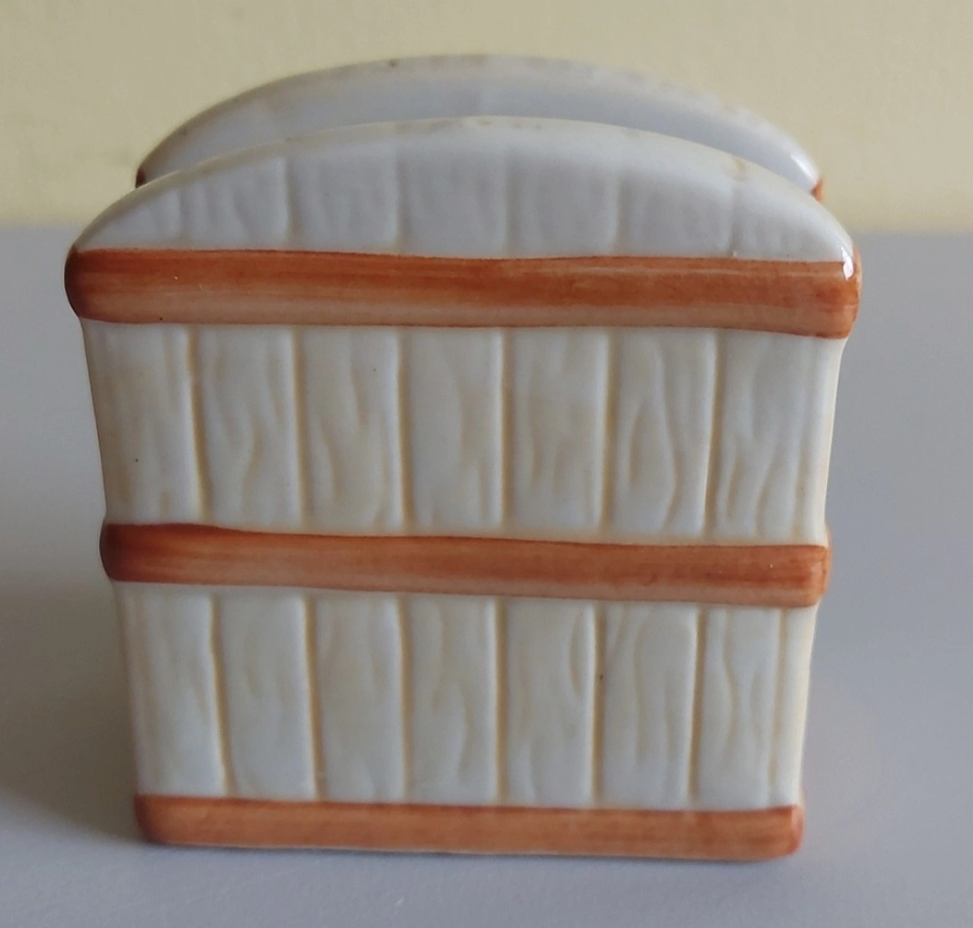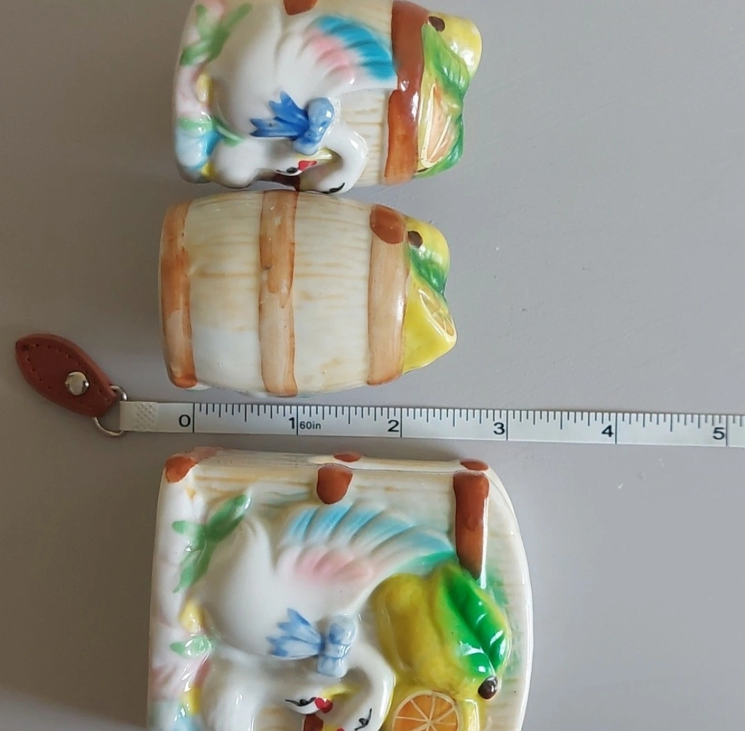 Sweet little set of salt and pepper shakers with matching napkin holder.