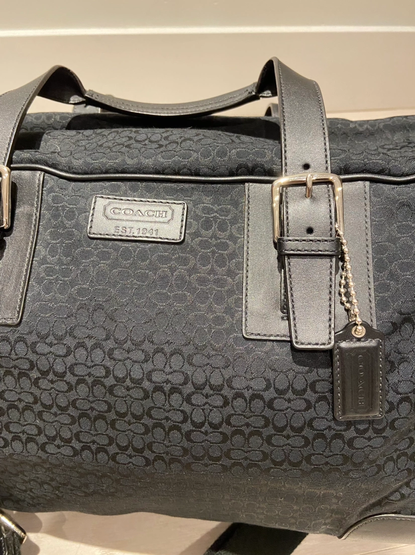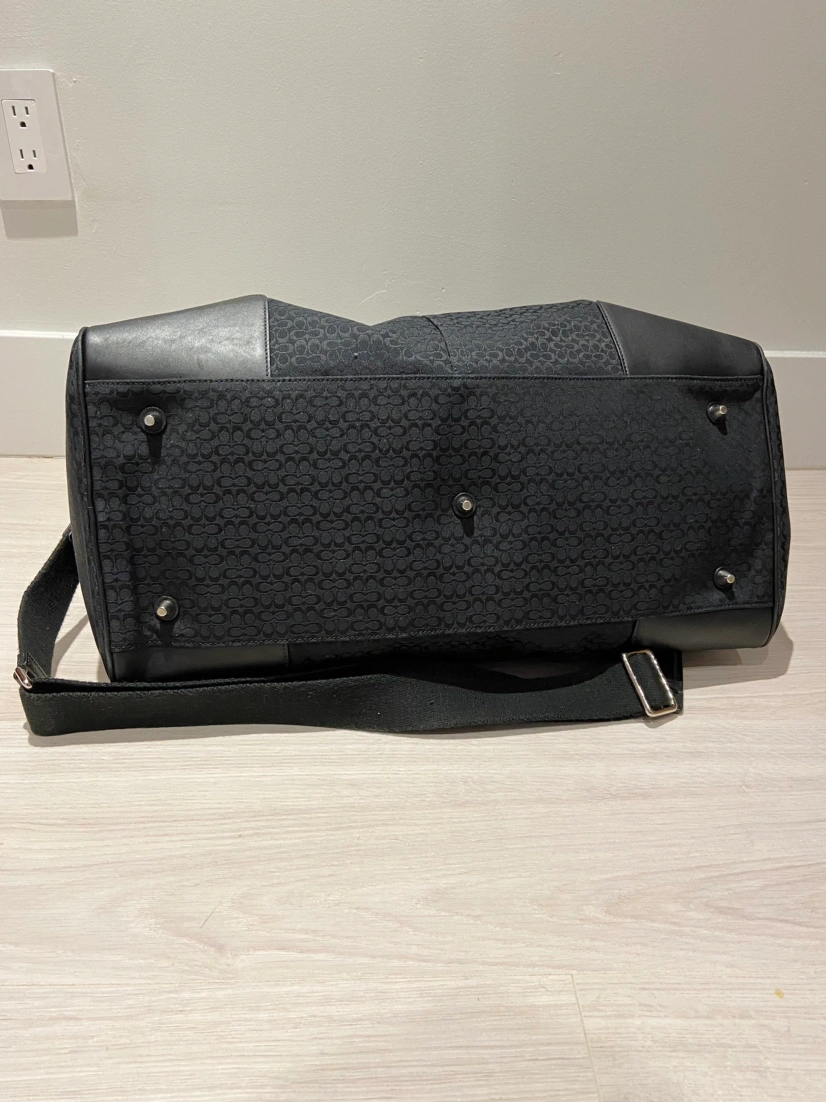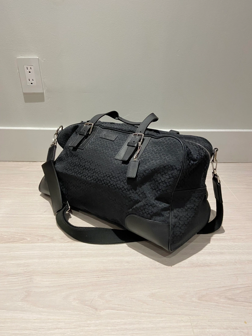 Coach black duffel bag in signature jacquard fabric and leather detailing. New never used without tags.