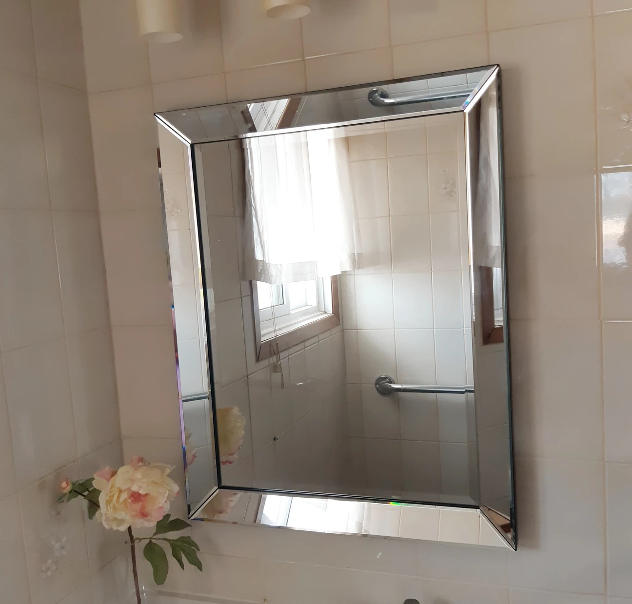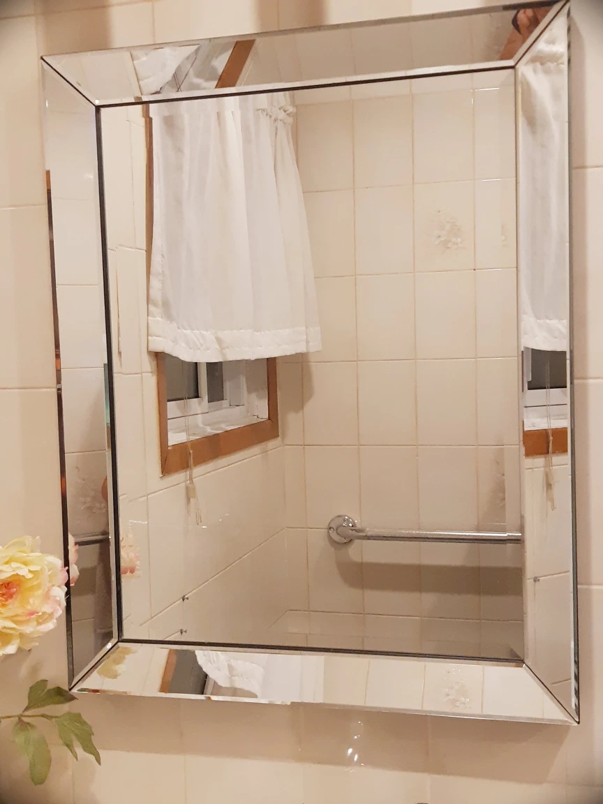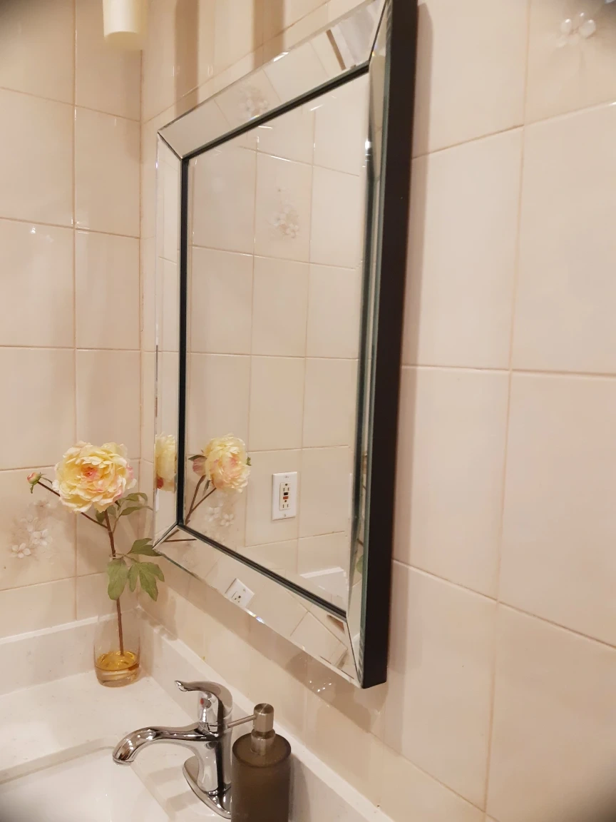 It looks even better in person, no damage just like new. could be hung vertically and horizontally,both ways. retail price was $150, heavyduty frame. perfect for vanities or entryways