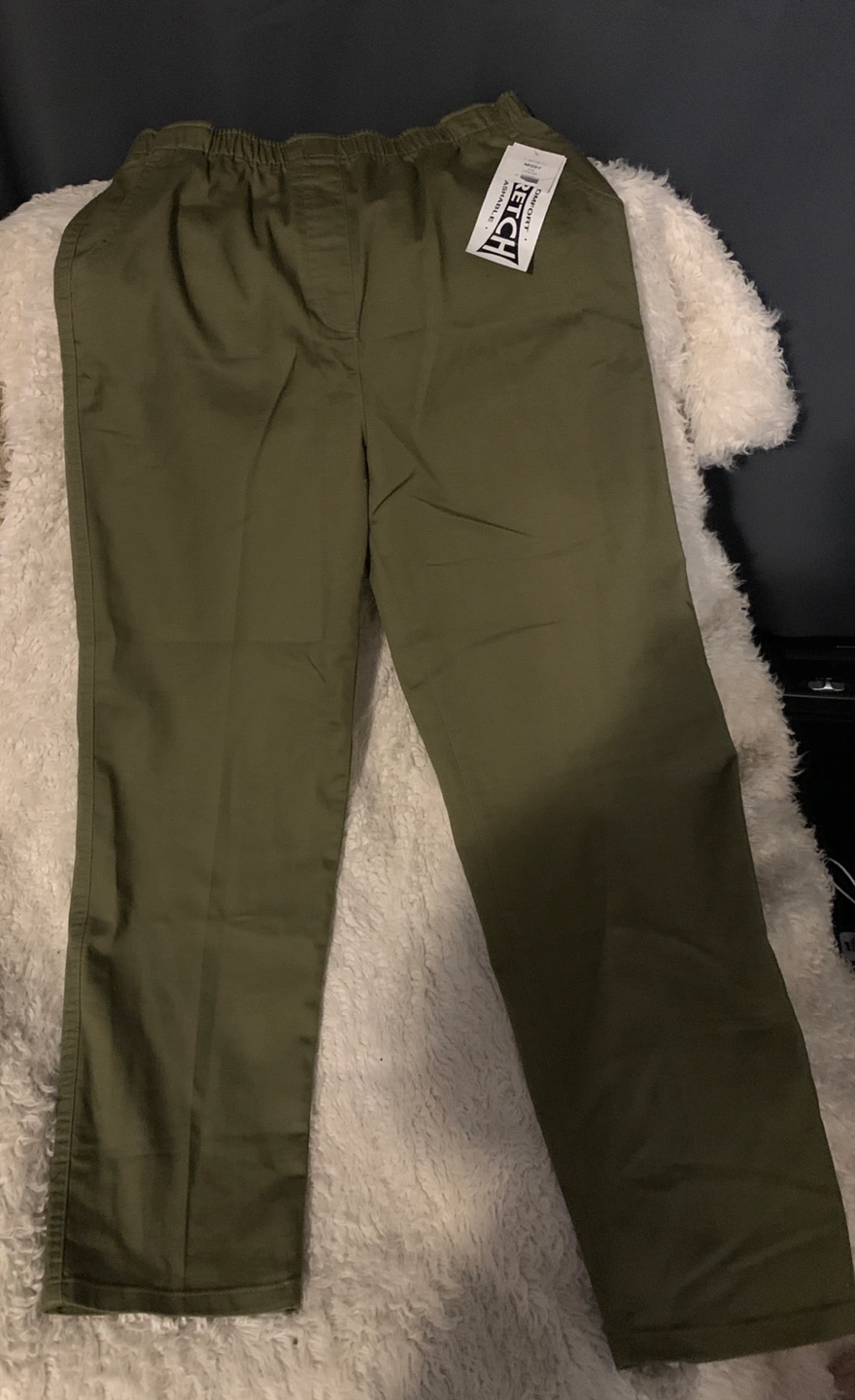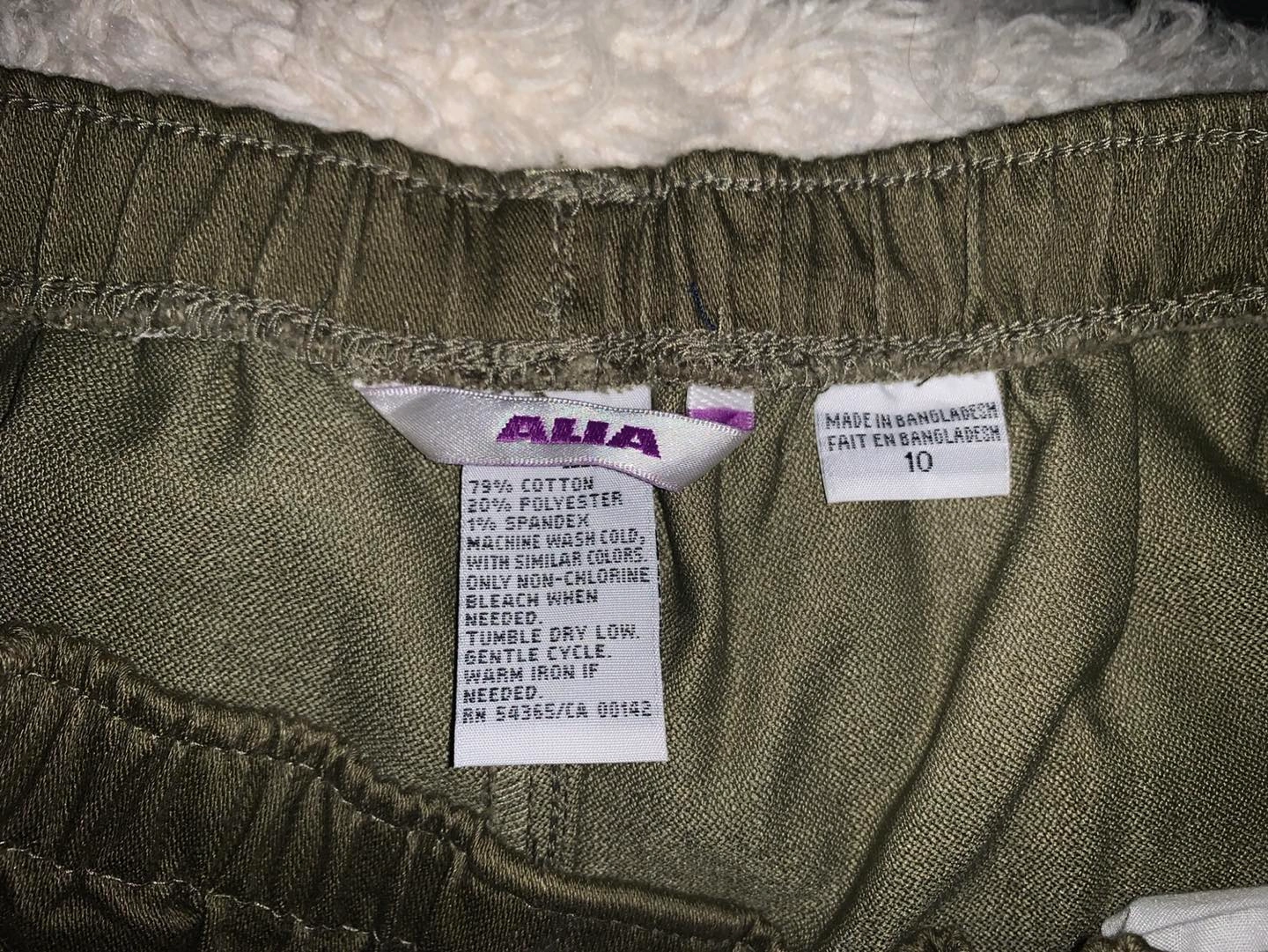 Army green elastic waist pants 👖. Size 10. Brand new still has all the tags on. They have two pockets in the front. They pants can be worn by anyone. Mainly made out of cotton.