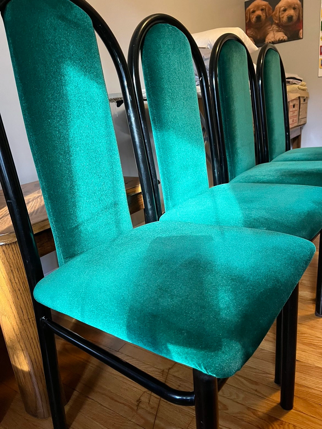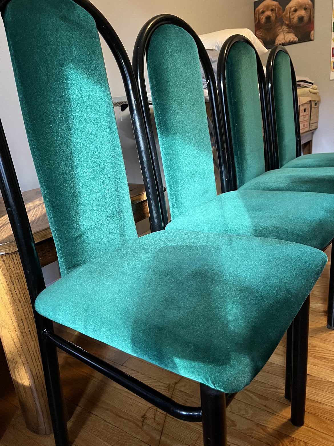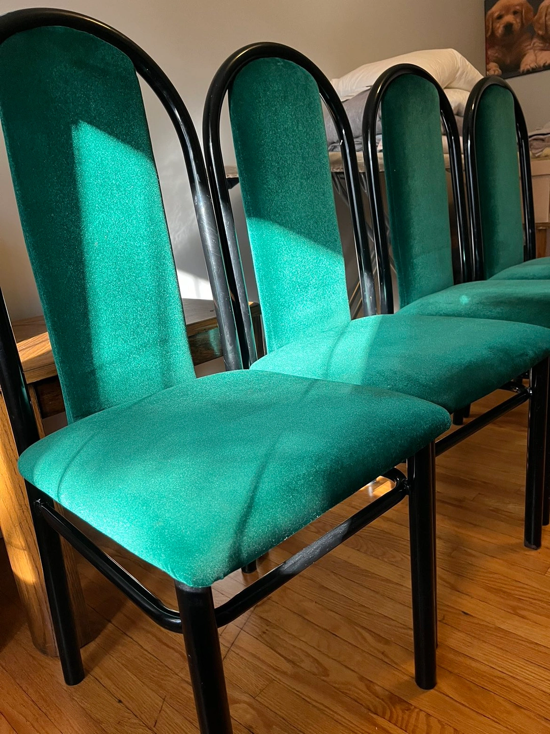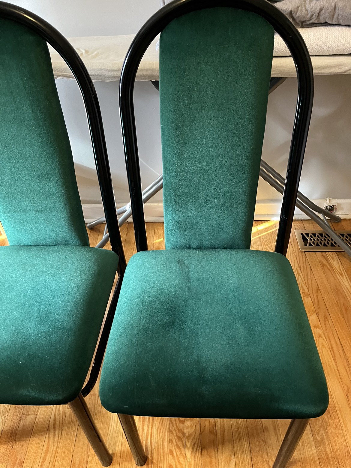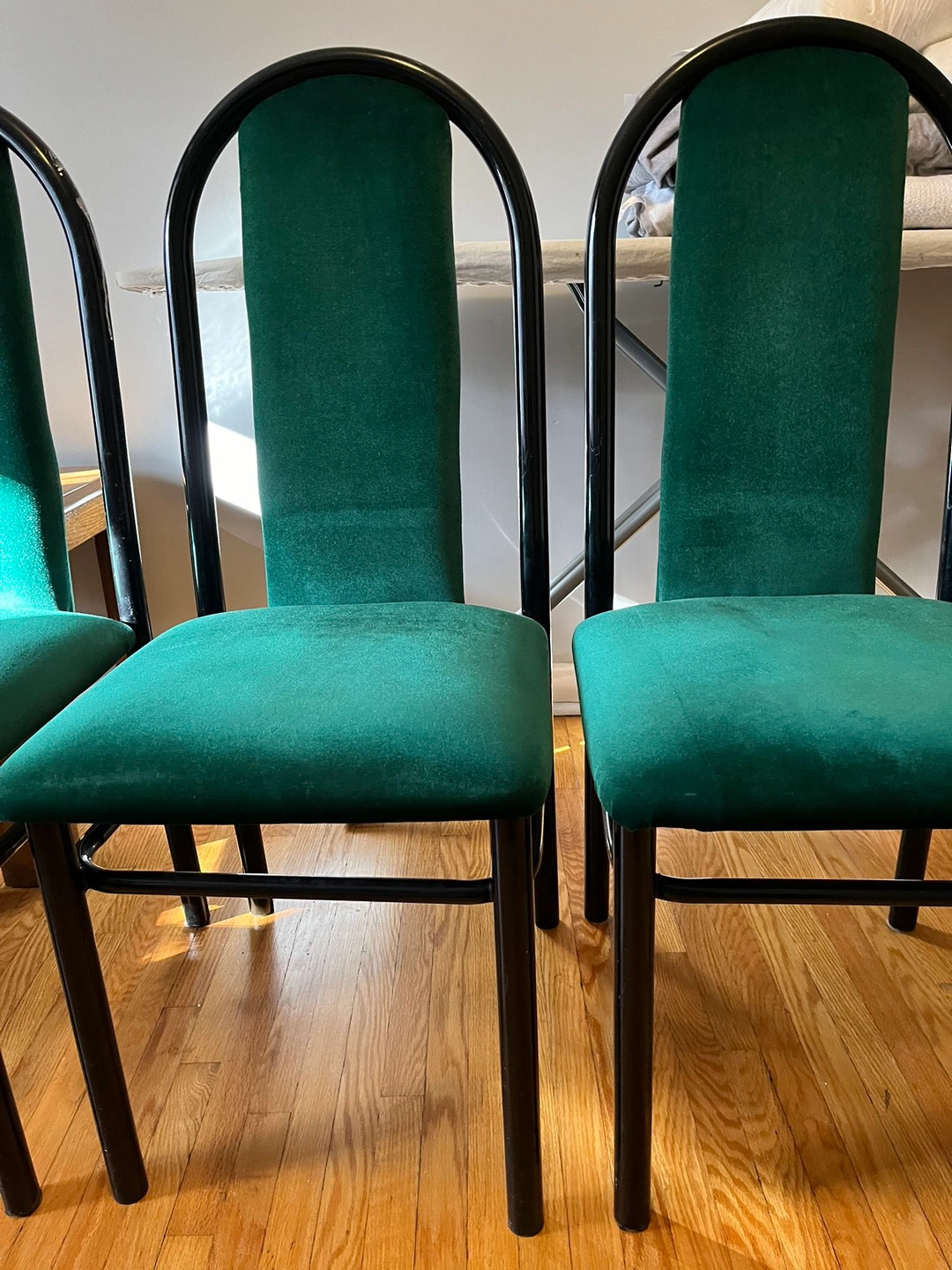 4 chairs: Green velvet seats with black metal frame. They’re solid and comfortable, in very good condition for your everyday use.