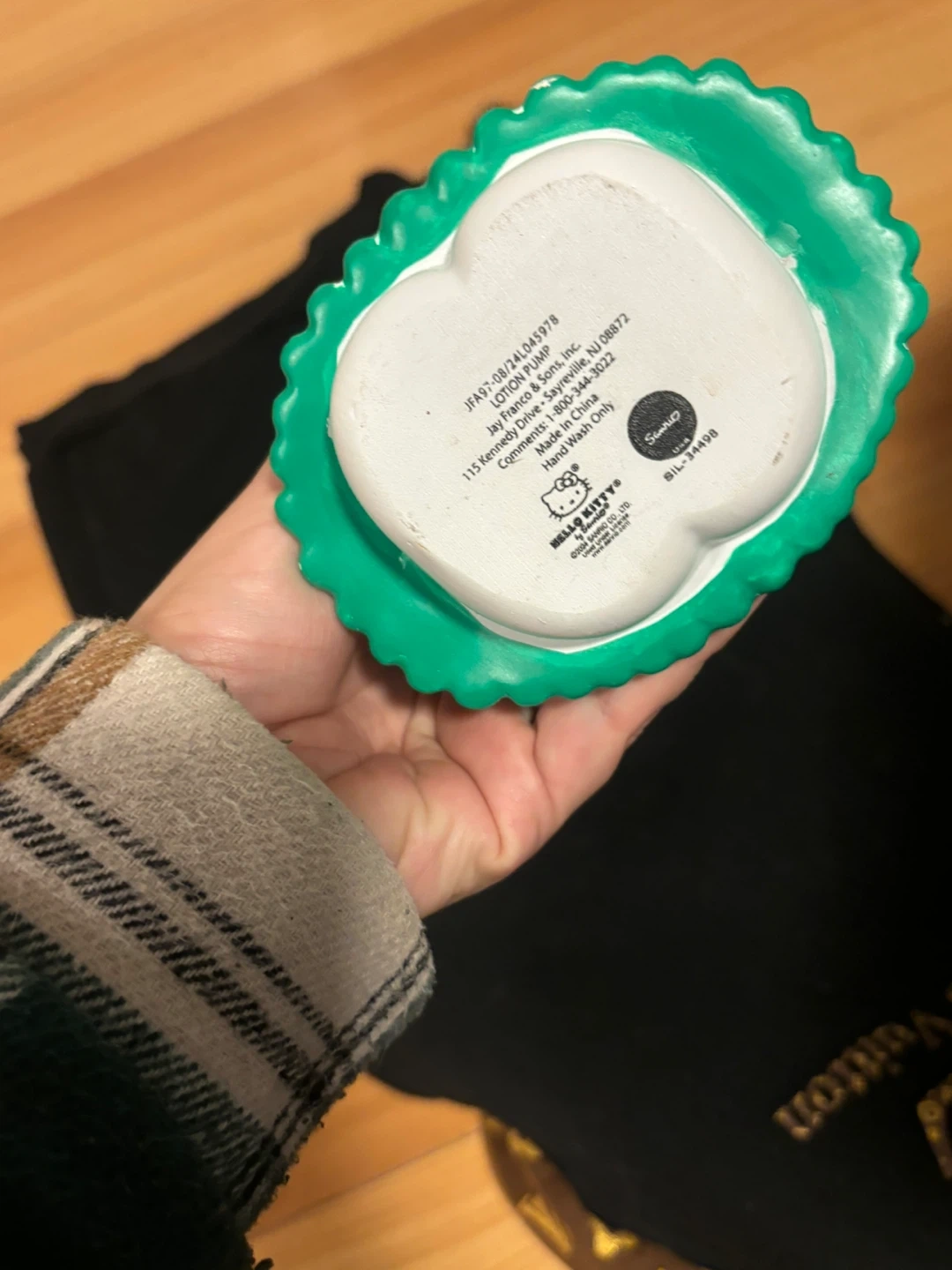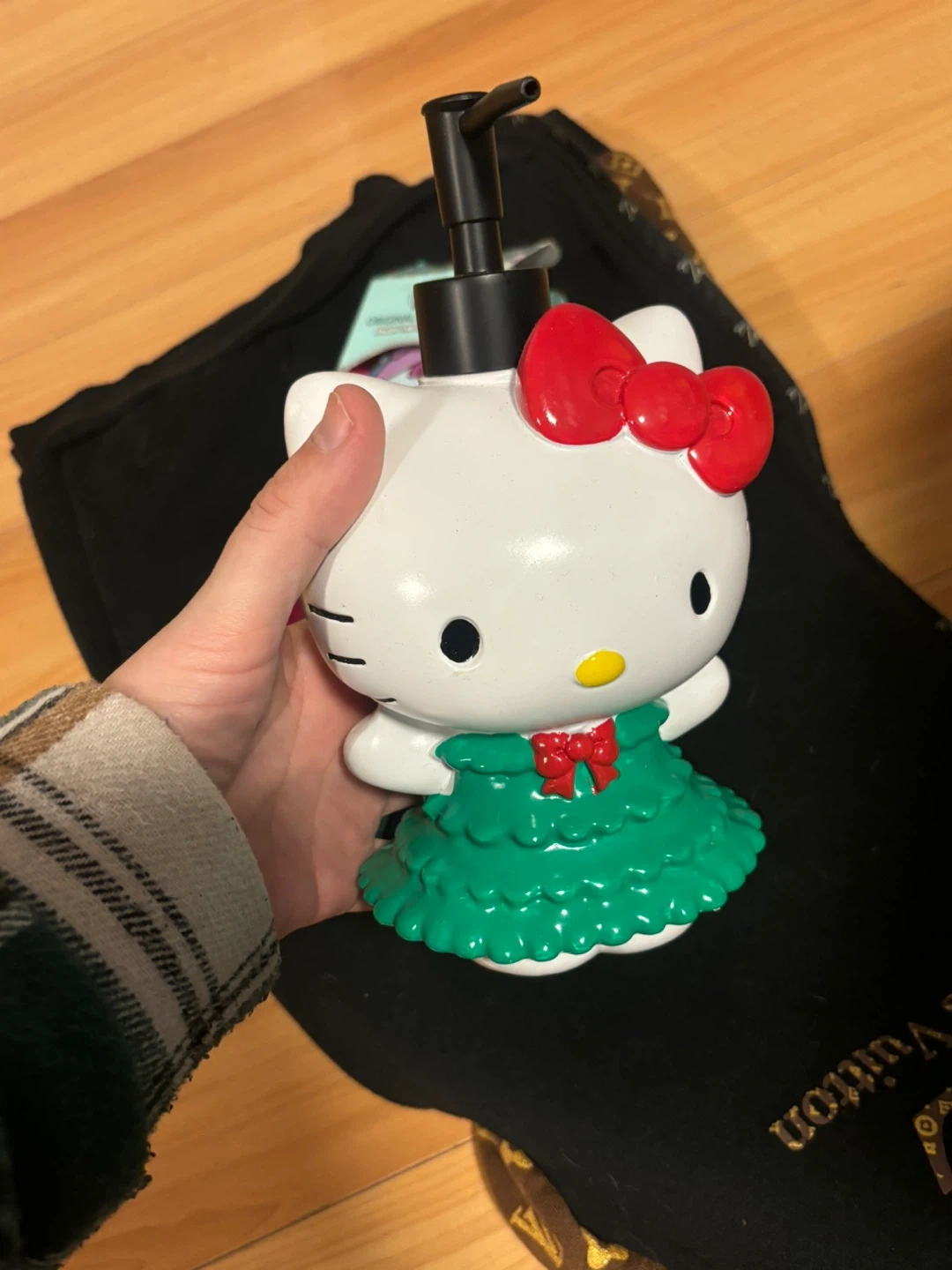This is a cute Hello Kitty lotion pump dispenser. It's shaped like Hello Kitty in a green dress with a red bow. Perfect for a kids' bathroom or any Hello Kitty fan! Open to offers