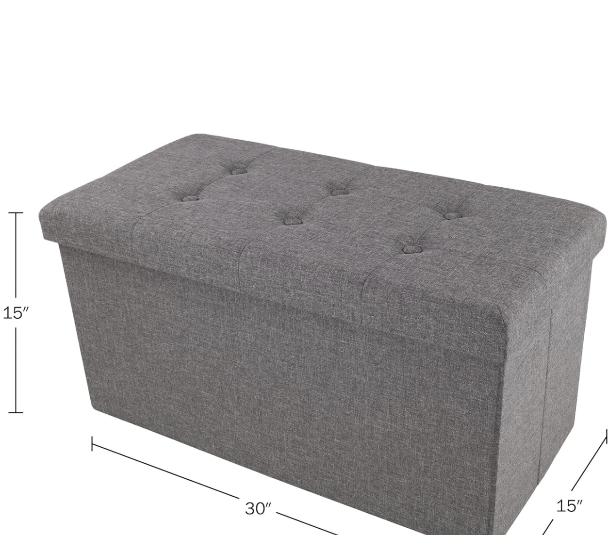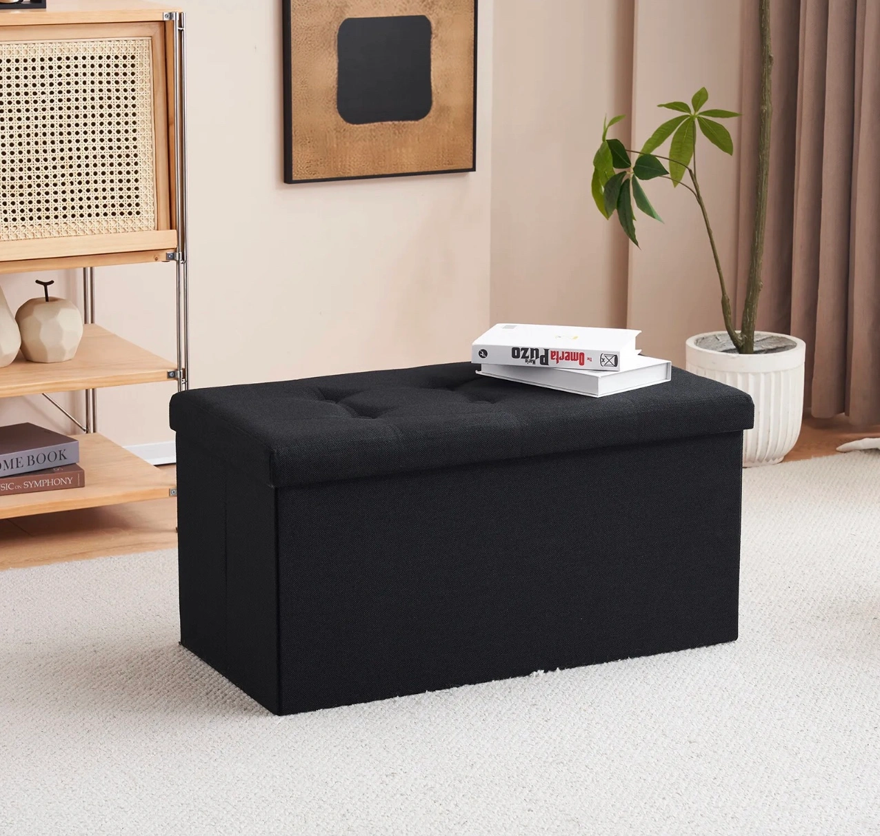 Folding Storage Bench Ottoman–30” Tufted Foam Padded Lid, in Black