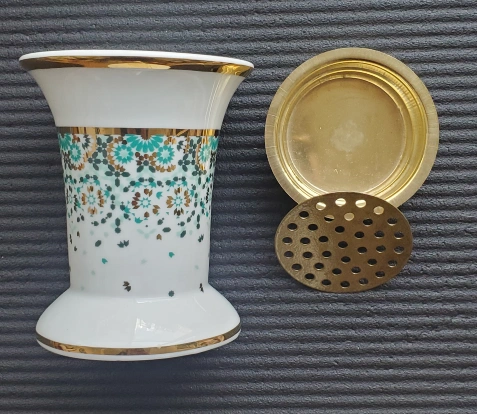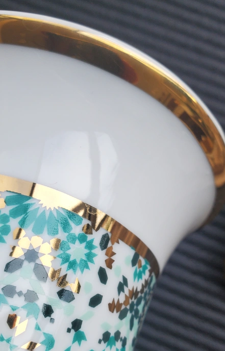 this beautiful incense burner was designed in UAE, made in Sri Lanka. it's crafted from classic porcelain and is embellished with geometric patterns in emerald, green and 22 karat gold.