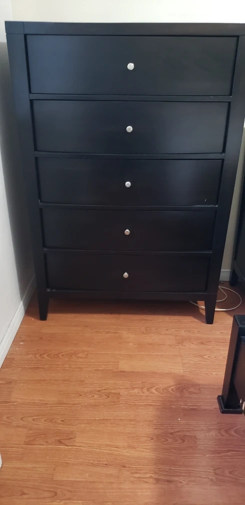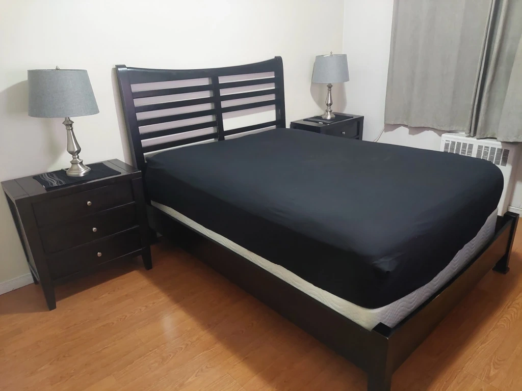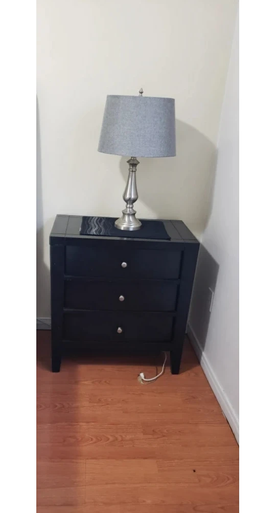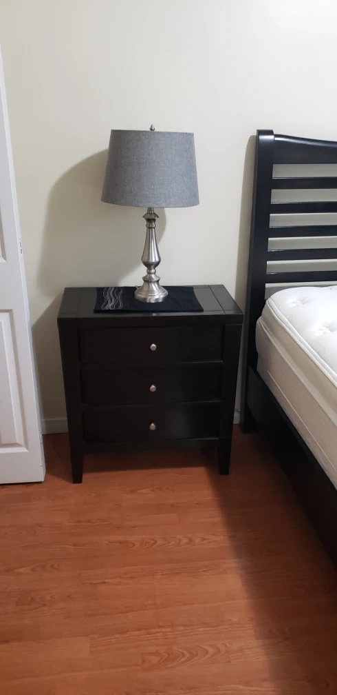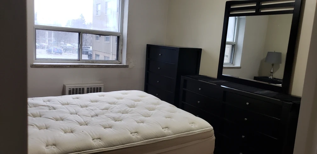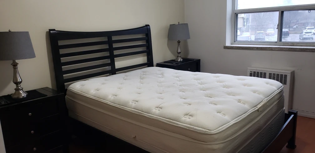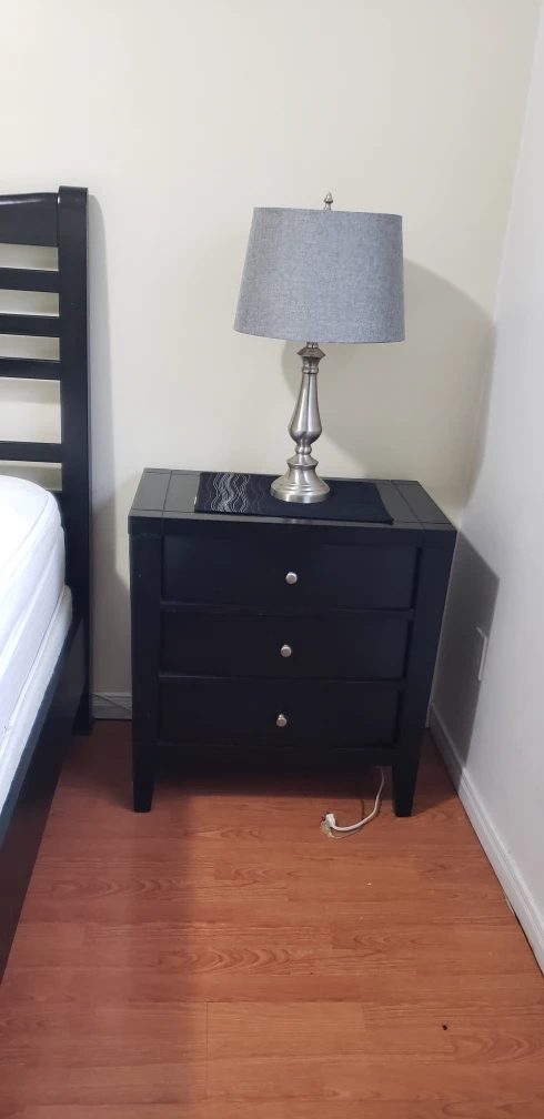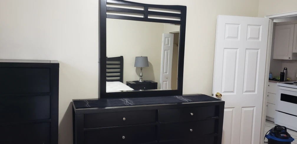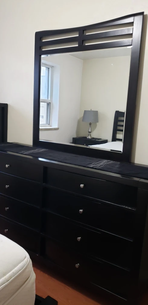 Selling a complete bedroom set including a queen size bed, pillowtop mattress with boxspring, 2 night stands, tall dresser, and a long dresser with mirror. The headboard has a piece missing but you can use your own bedframe. Will include 2 lamps, rubber floor stoppers, and table runners.