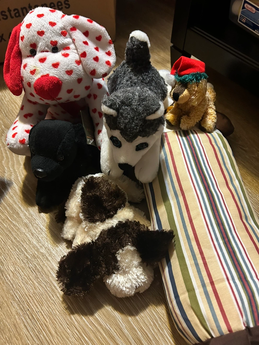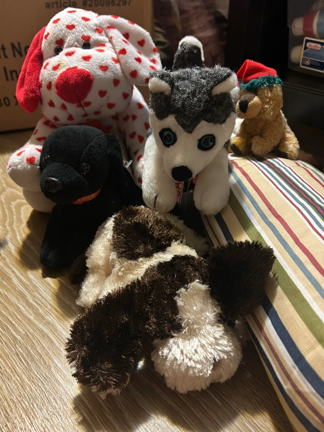 Collection of five plush dog toys. Features a large white dog with red hearts, a black dog, a husky, a brown and white dog, and a small golden dog with a Santa hat. Made from soft plush material.