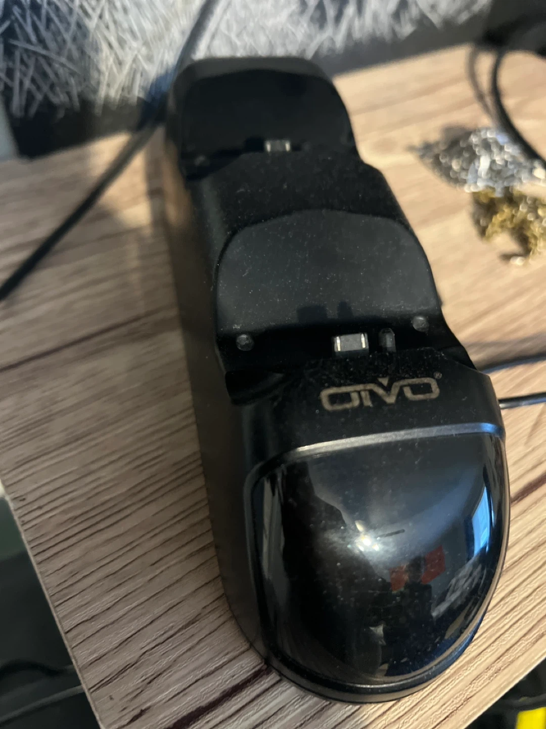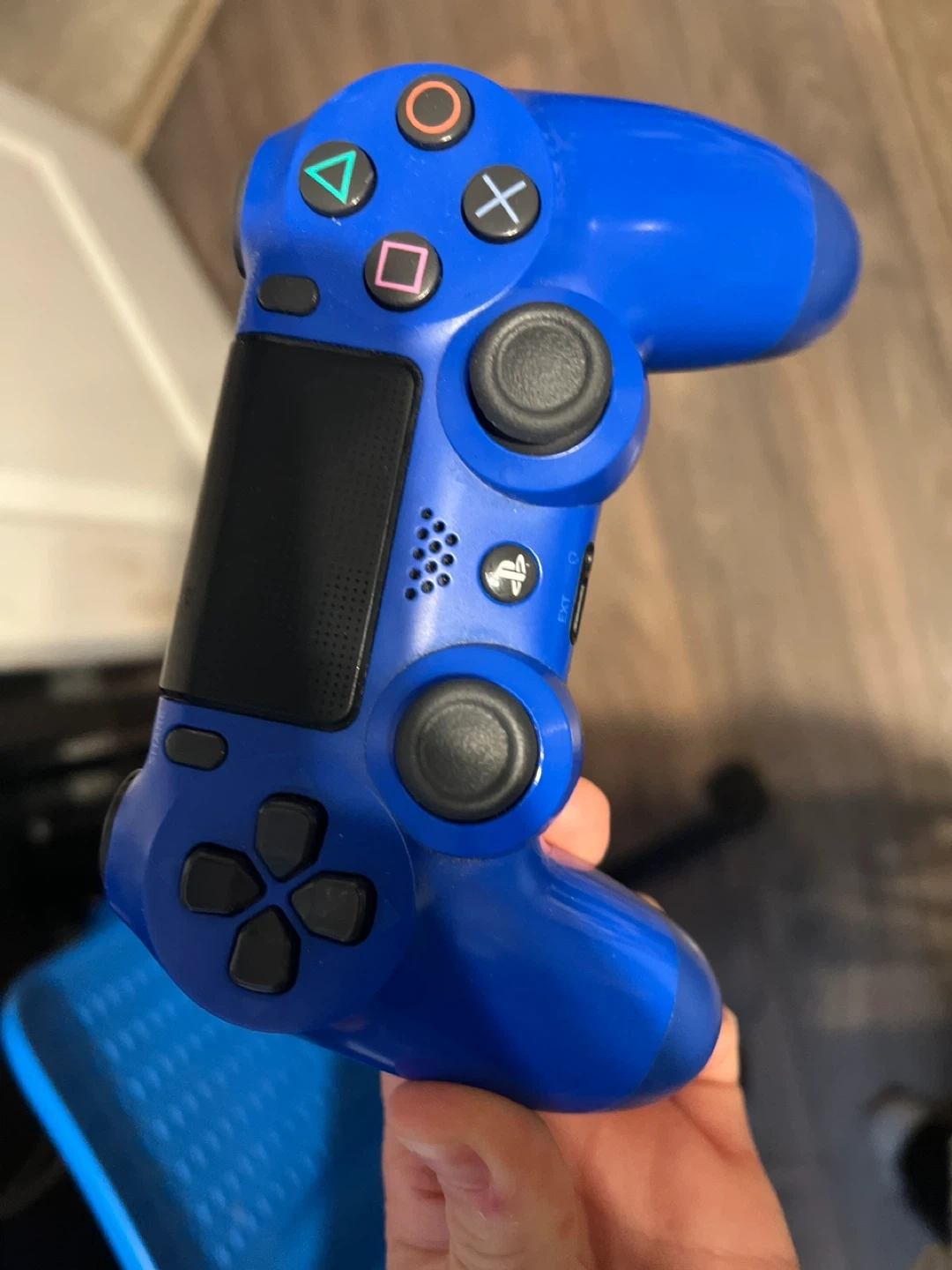 Selling a blue PlayStation 4 controller in used condition . Also included is a charging station by Oivo for convenient charging of your controller, storage needs to be cleaned out. Selling for my son
