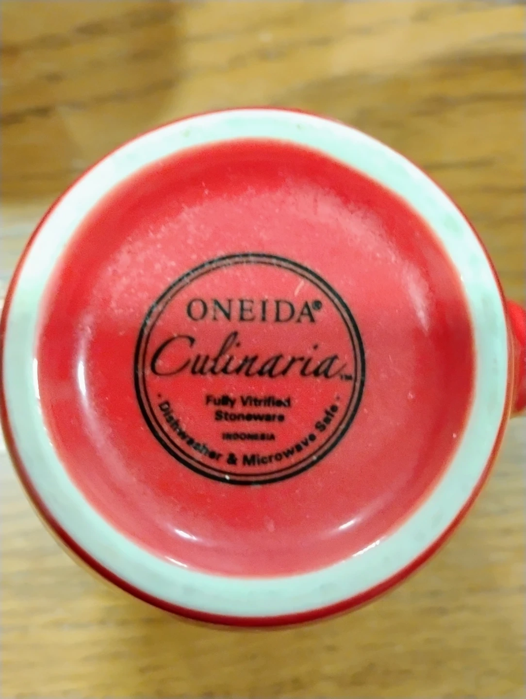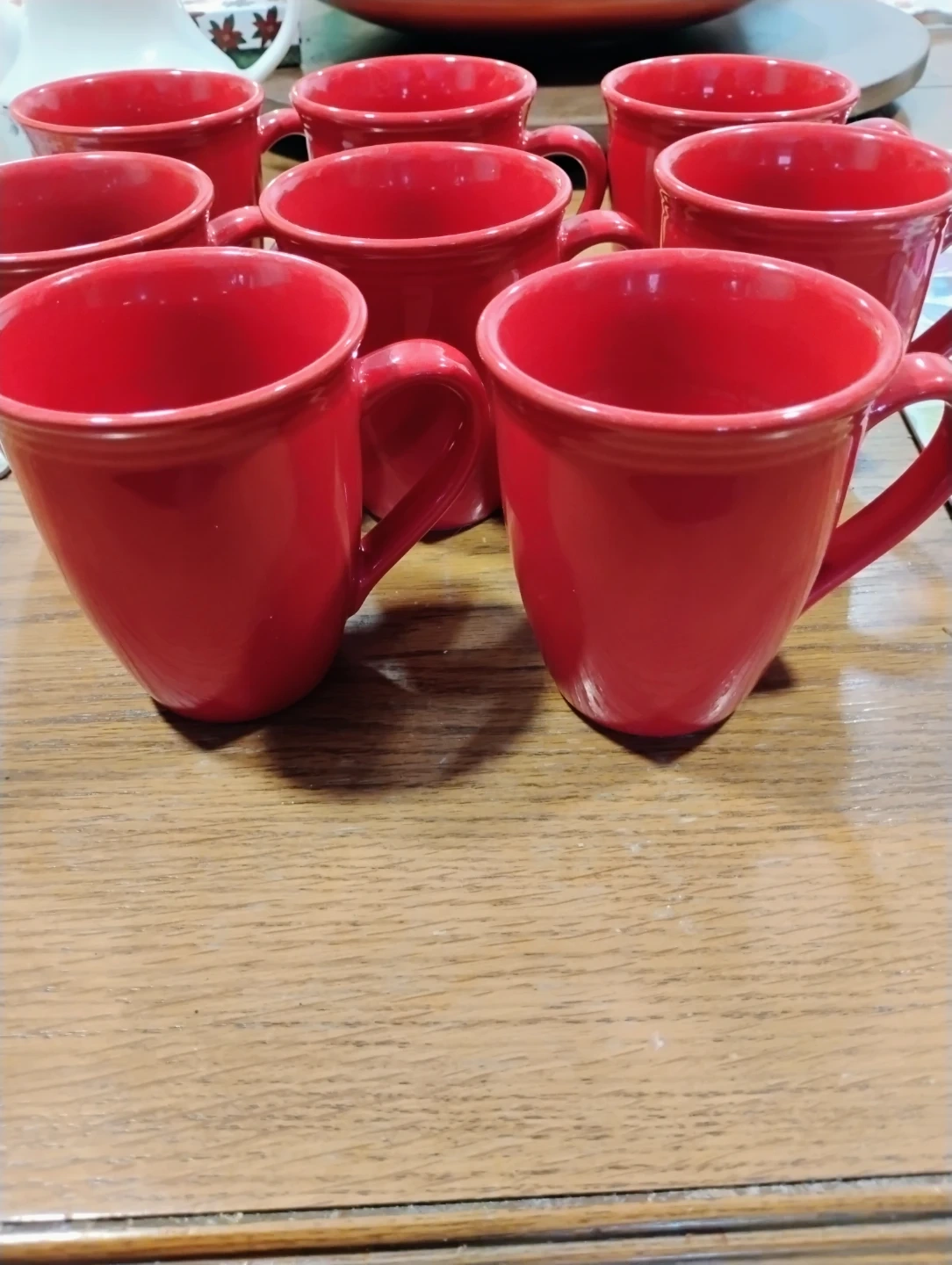This set includes eight red Oneida Culinaria mugs. Fully vitrified stoneware material. They're dishwasher and microwave safe. Useful for everyday beverages or entertaining guests!