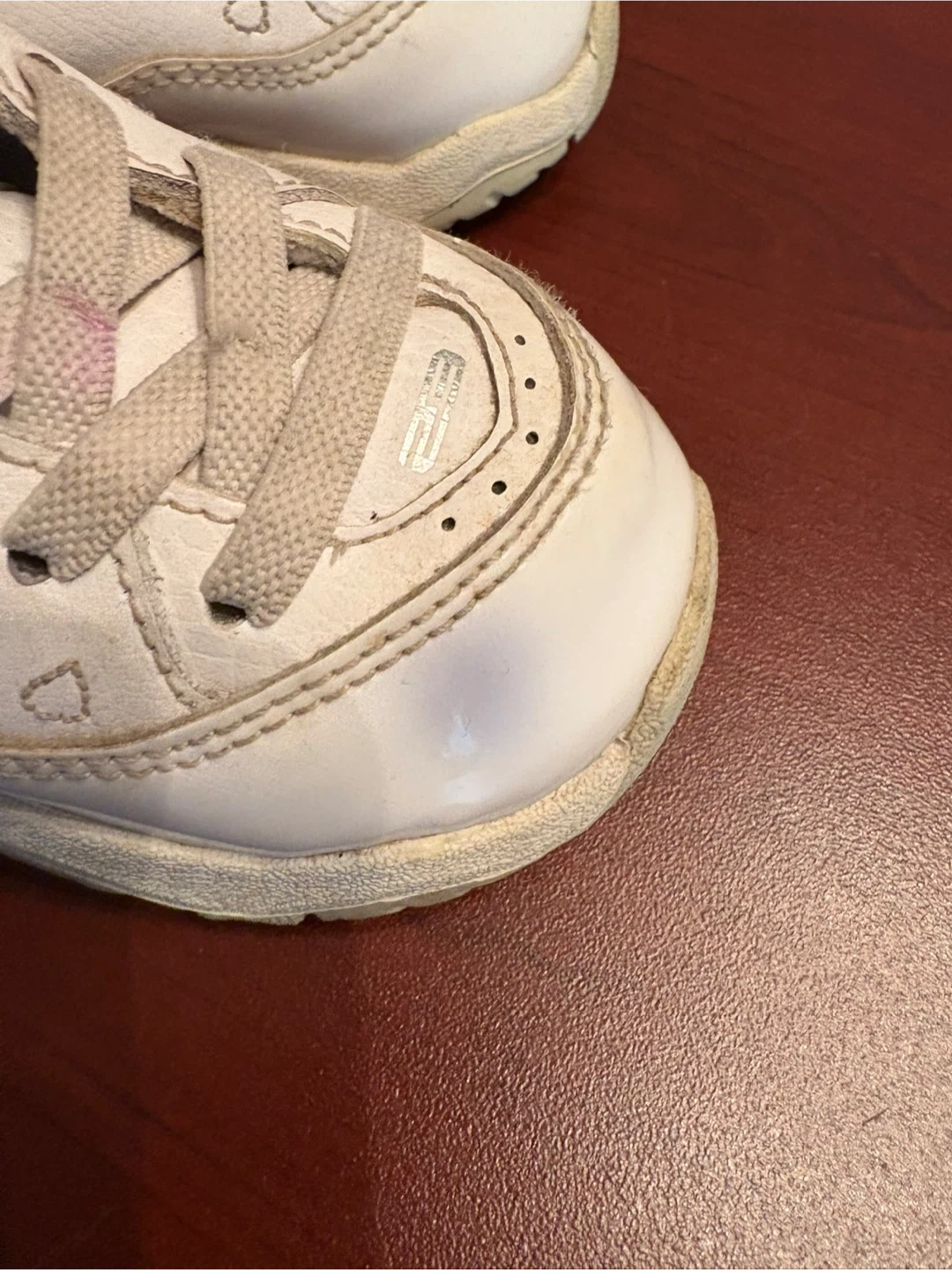 White Jordan crib shoes with velcro strap. Size 5C Classic Jordan logo on the sole. Perfect for little ones learning to walk! Approximate Foot Length: 4.9–5 inches or ~12.6–13 cm. Age beginning around 9+ months and up.
