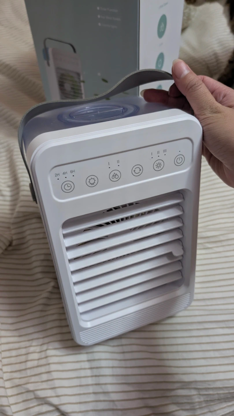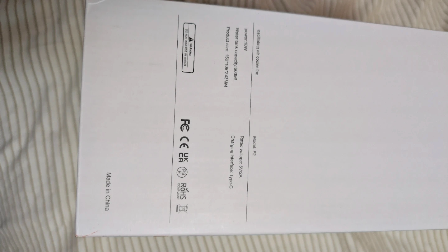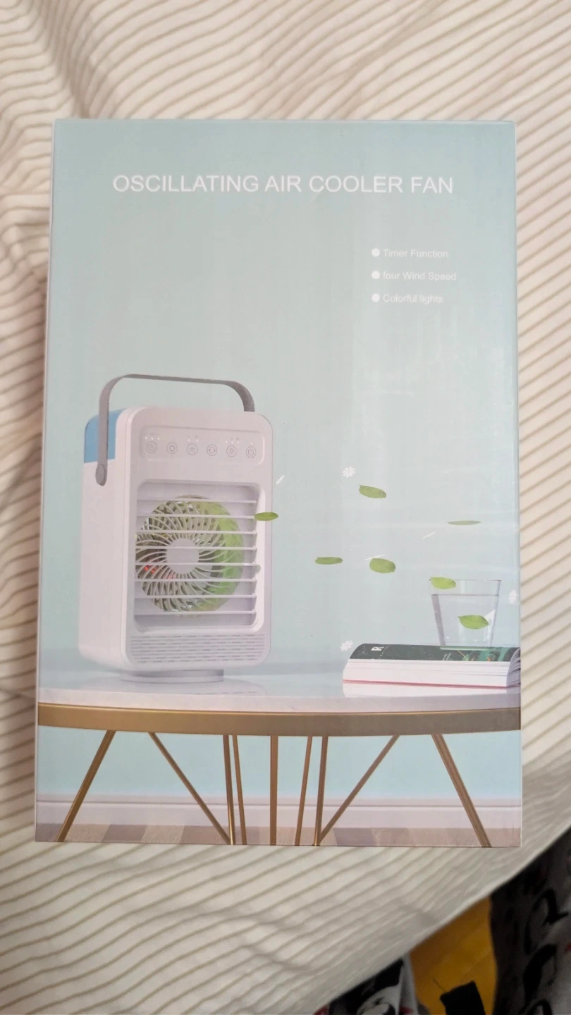 This is a portable oscillating air cooler fan. It features a 600ML water tank capacity and multiple speed settings. The fan includes a timer function and colourful lights. It charges via Type-C. Power is 10W. No cord.