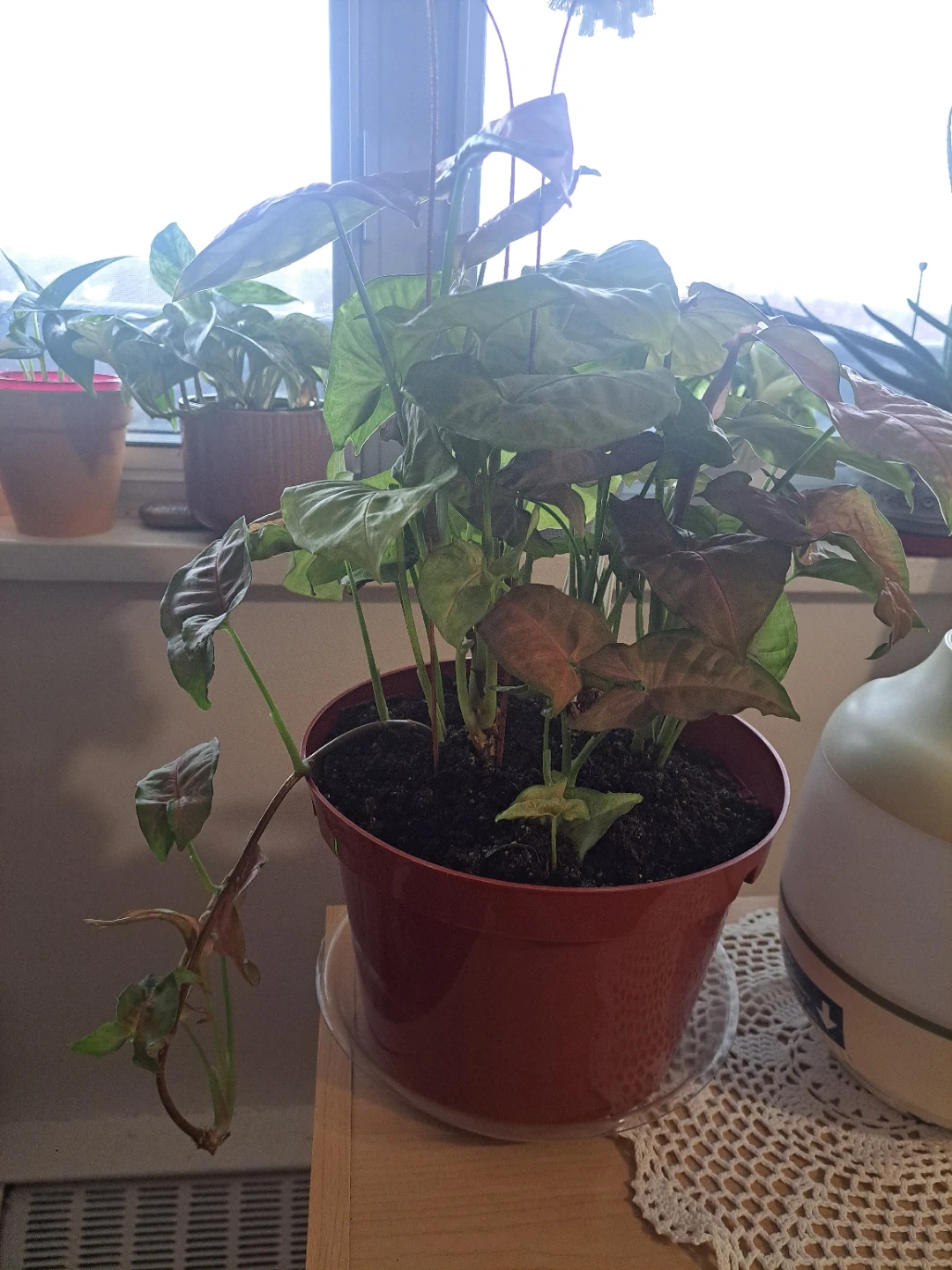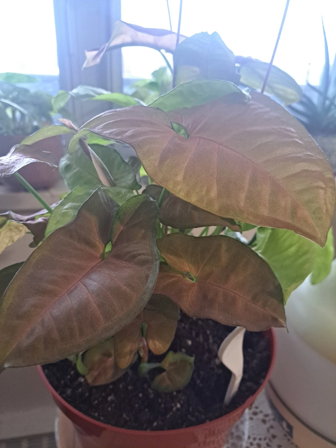 This Neon Syngonium plant has vibrant leaves with a mix of green and reddish-brown tones. It's potted in an 8-inch nursery container. This plant brings a touch of nature indoors!