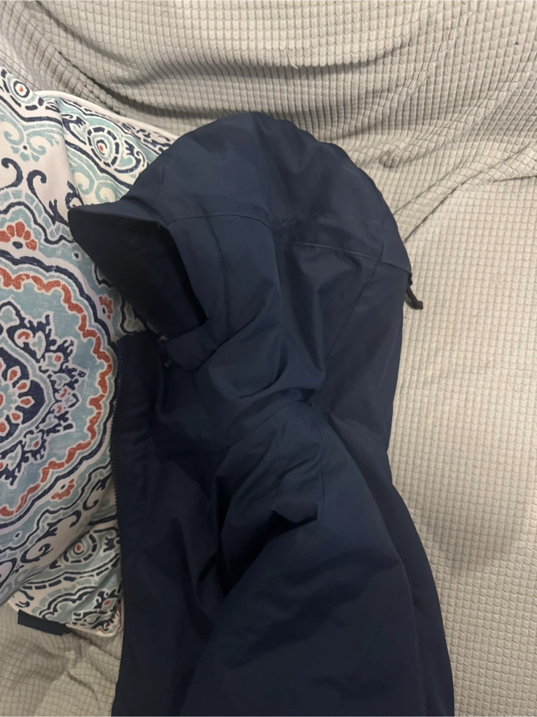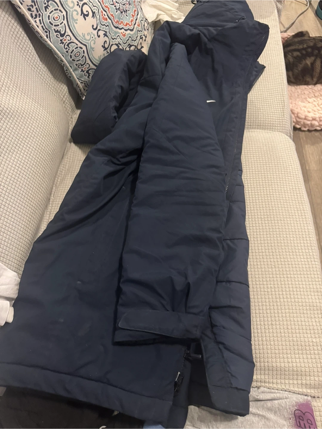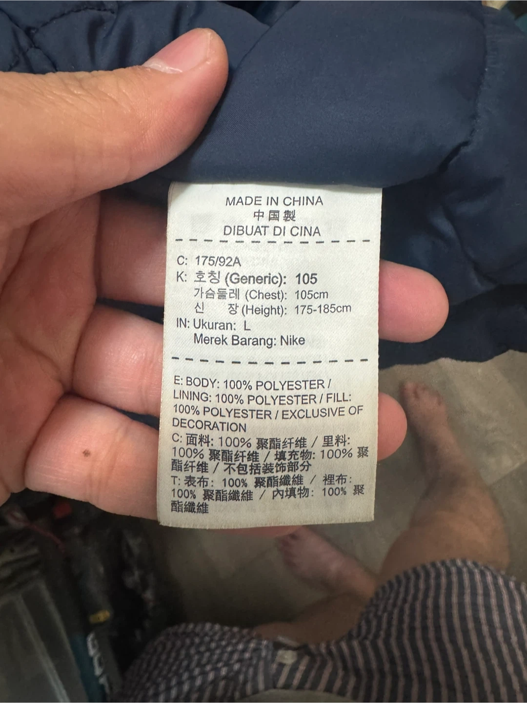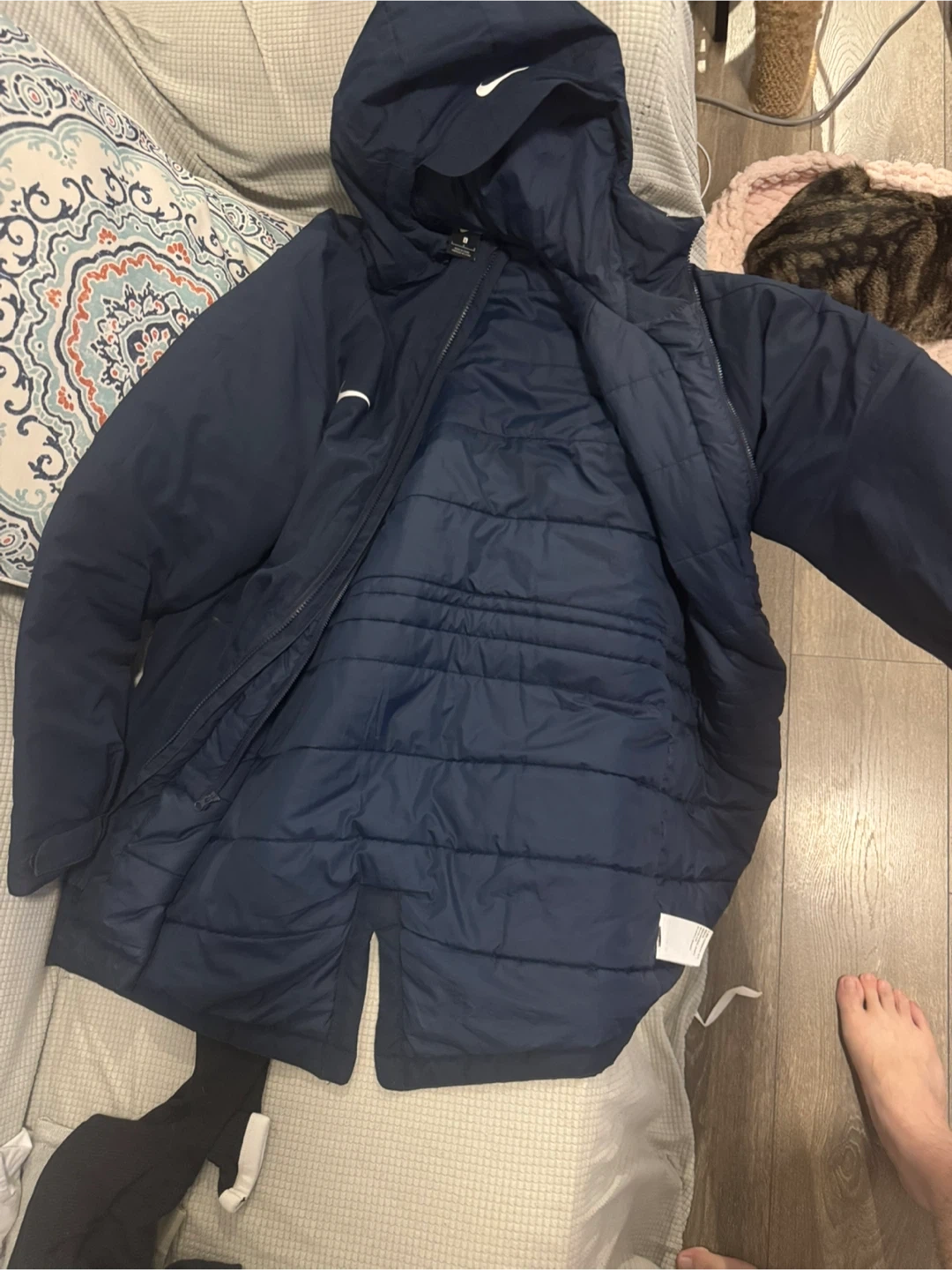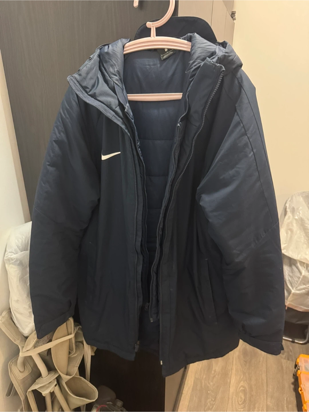 Selling a Nike winter jacket in navy blue, size large. It's in great condition and ready to keep you warm this winter! The jacket is made of 100% polyester.