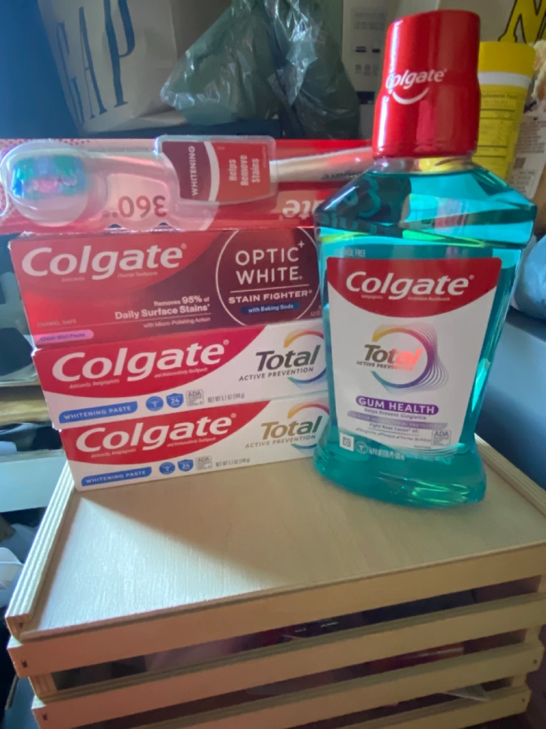 This set includes 3 Toothpastes, 1 toothbrush and one bottle of Colgate Gum Health Mouthwash. The toothpaste features a Stain Fighter formula with baking soda to remove surface stains. The mouthwash helps prevent gingivitis.