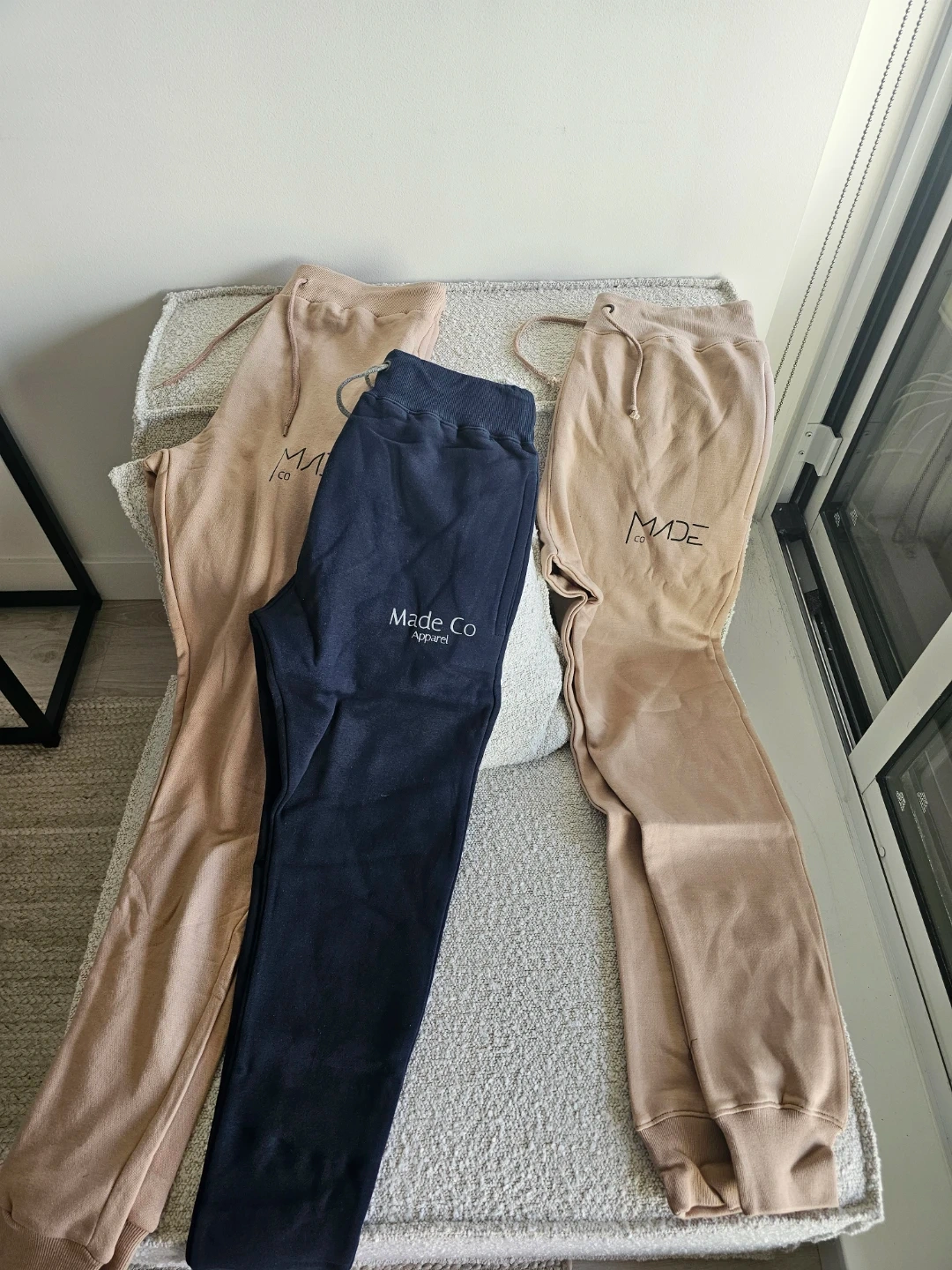 Three pairs of Made Co Apparel joggers, one navy and two tan. These comfortable sweatpants are perfect for lounging or casual wear. They're made from a soft fabric blend for all-day comfort.