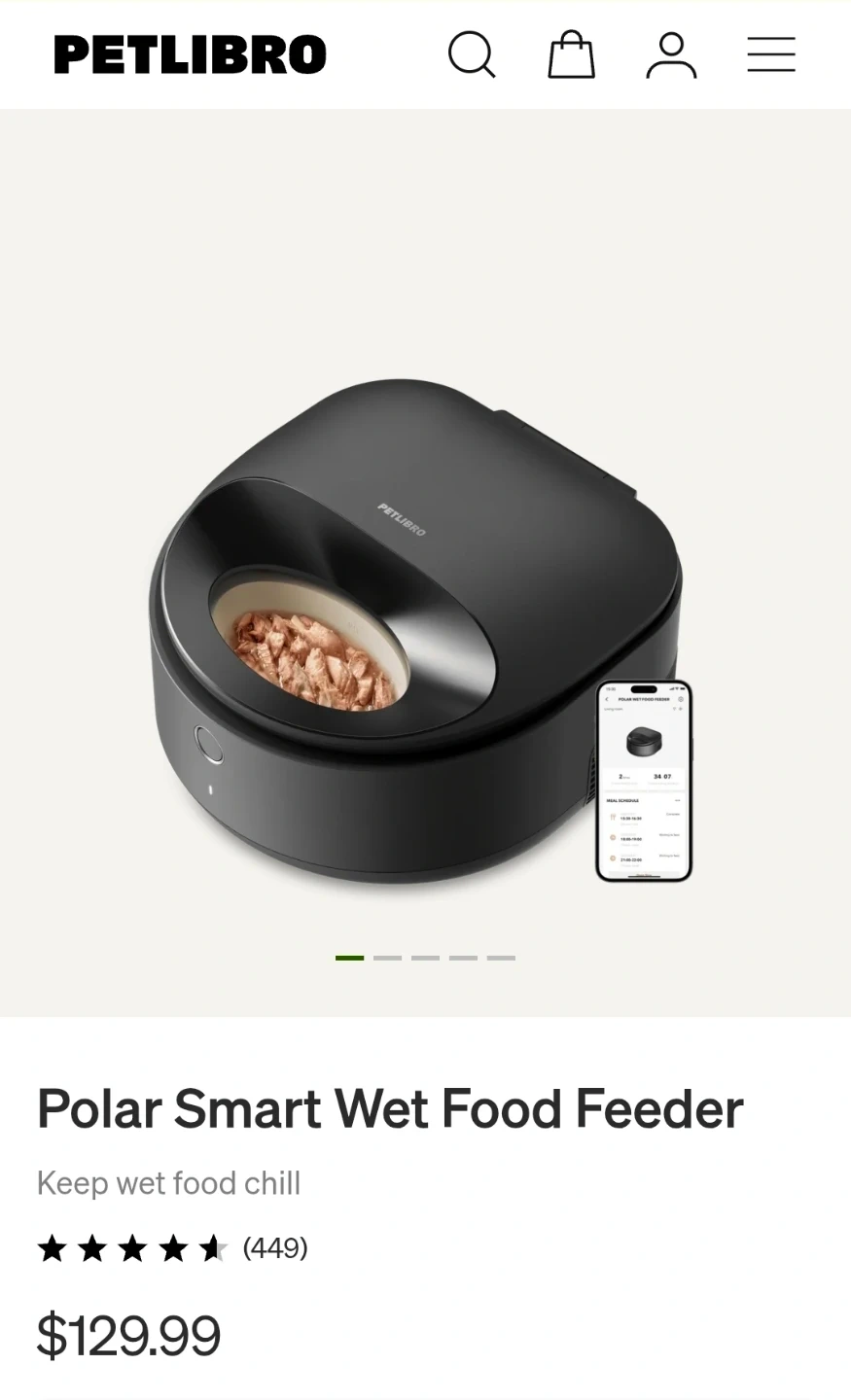 This is the PETLIBRO Polar Smart Wet Food Feeder. It's designed to keep wet food chilled. The device is black and includes a smartphone app for scheduling feeding times.
