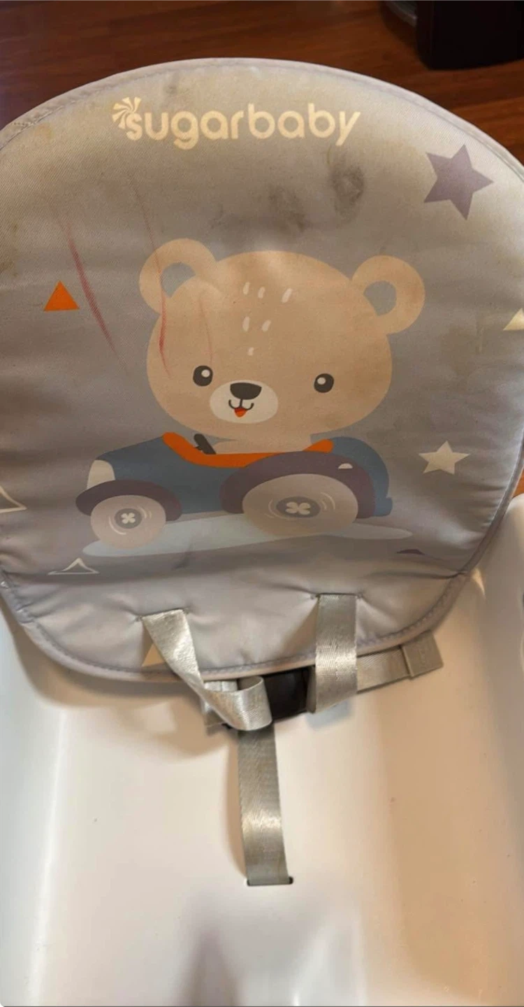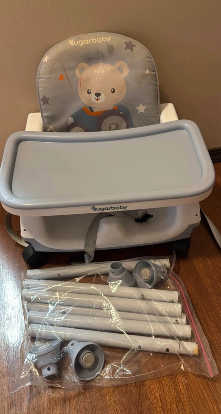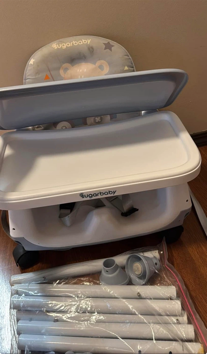 Sugarbaby 6-in-1 convertible fun chair. Converts to high chair, booster seat, or toddler chair. Includes tray and harness. Parts shown are included.