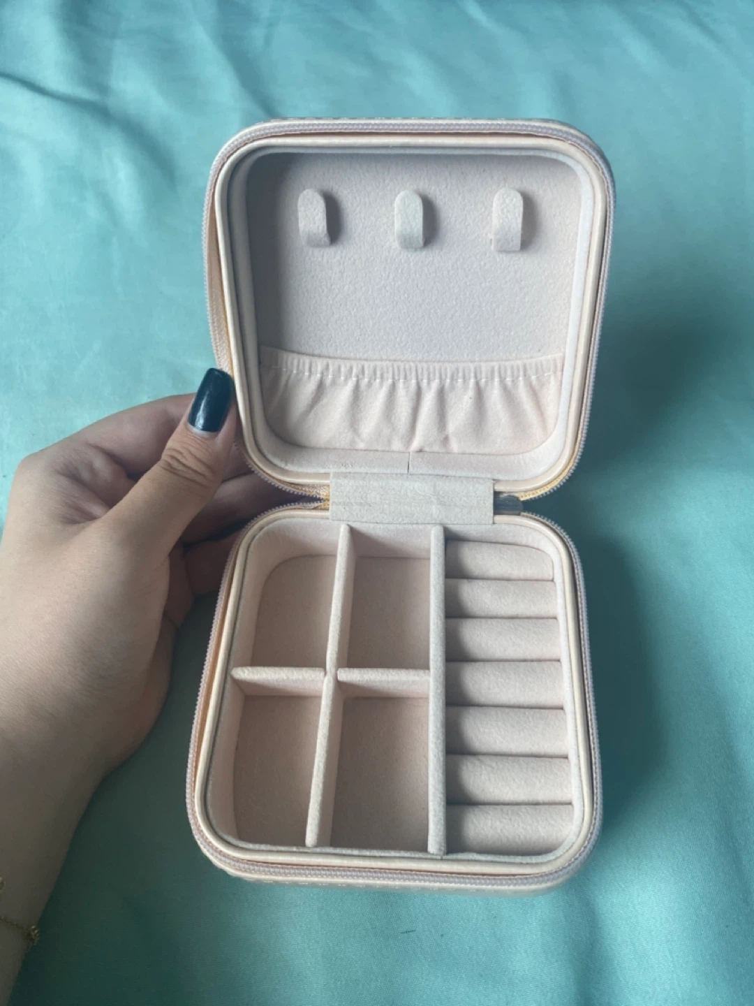 Selling a cute pink travel jewelry box! It's perfect for keeping your earrings, rings, and necklaces organized while you're on the go. It has a soft, felt-lined interior to protect your precious pieces