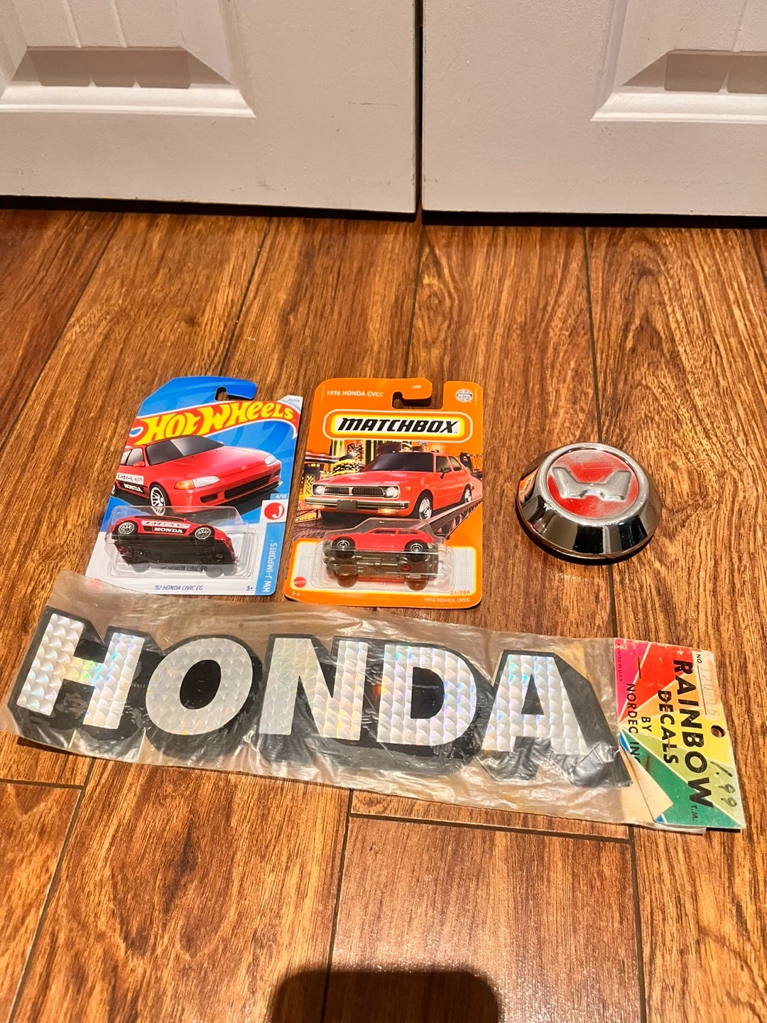 Selling a collection of Honda diecast cars! Includes a Hot Wheels '92 Honda Civic EG and a Matchbox 1976 Honda CVCC. Also comes with a vintage Honda decal and a Honda hubcap emblem