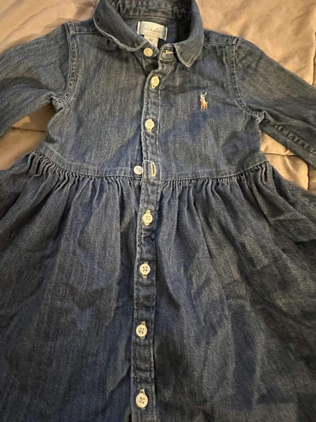 Ralph Lauren denim dress for baby girls. It's a size 9 months. Features a button-down front and a ruffled skirt. Made from 100% cotton. Pick up only East 106 and 1st ave … cash only!