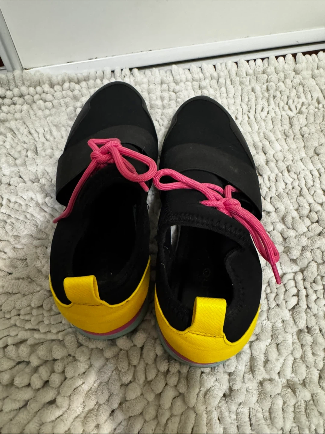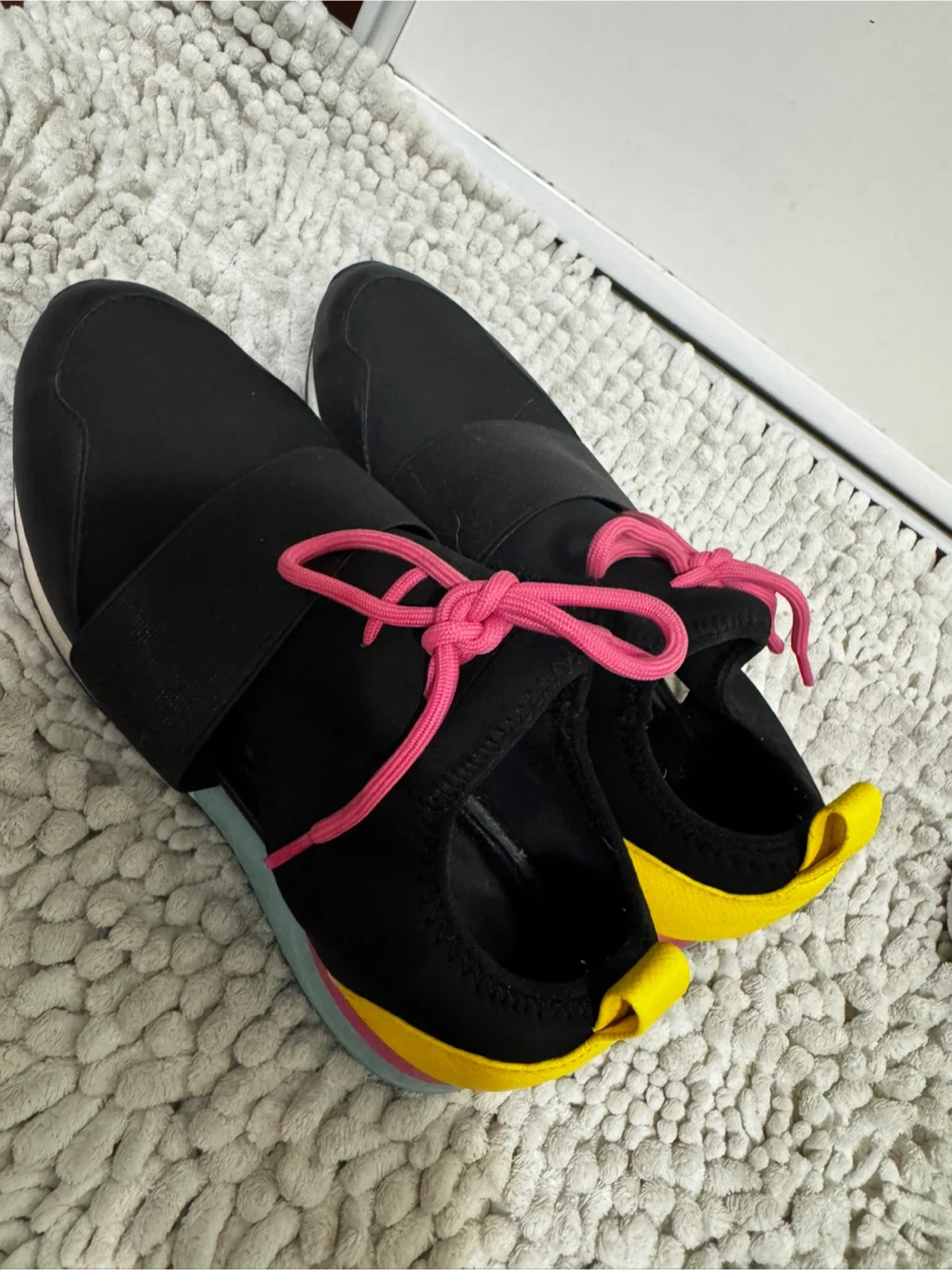 These ALDO sneakers are black with bright pink laces and yellow heel accents. They feature a comfortable slip-on design with a convenient pull tab. Great for casual wear!