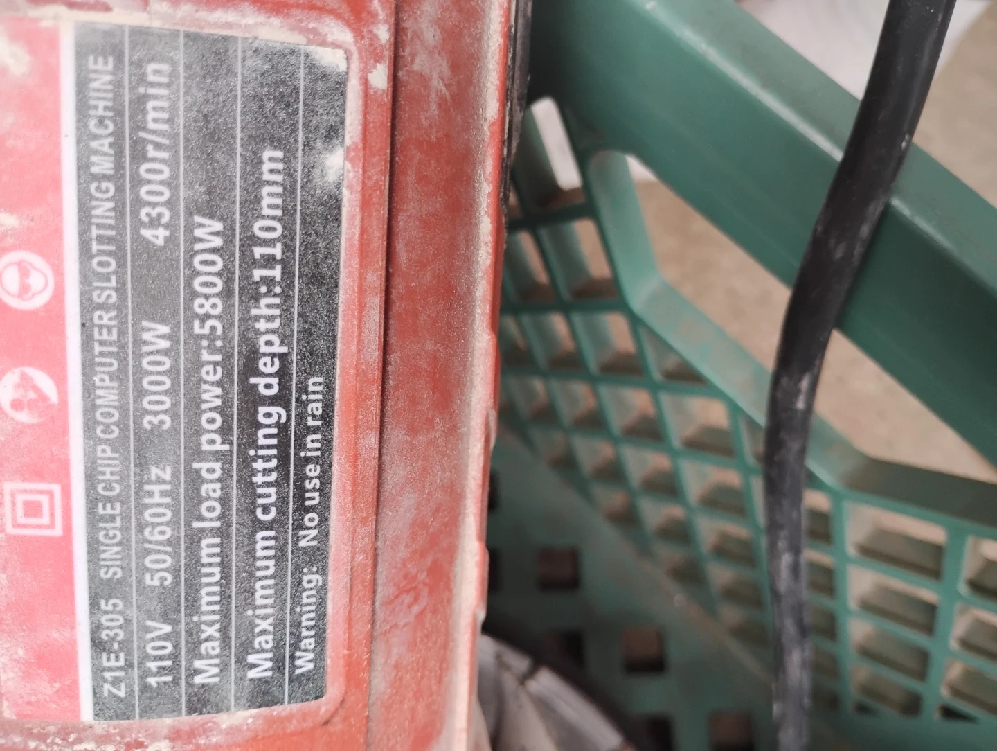 This is a Z1E-305 single chip computer slotting machine. It runs on 110V, 50/60Hz with a maximum load power of 5800W and 3000W. Maximum cutting depth is 110mm. The saw speed is 4300r/min.