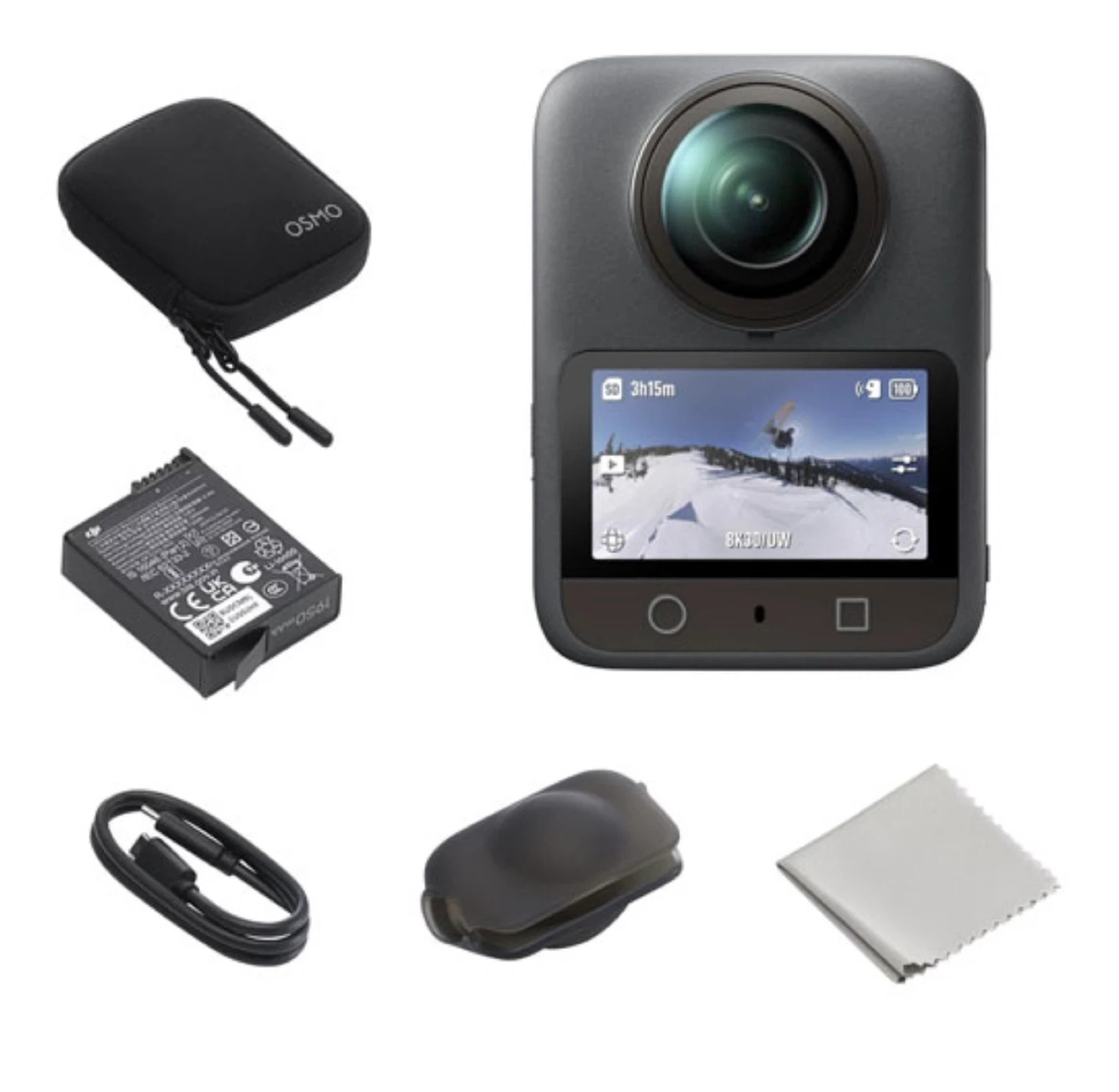 Capture your adventures with the DJI Osmo Action 3 camera. It's designed for action, featuring a durable build and excellent stabilization. Includes protective case, battery, charging cable, lens cap, and cleaning cloth. OPEN BOX