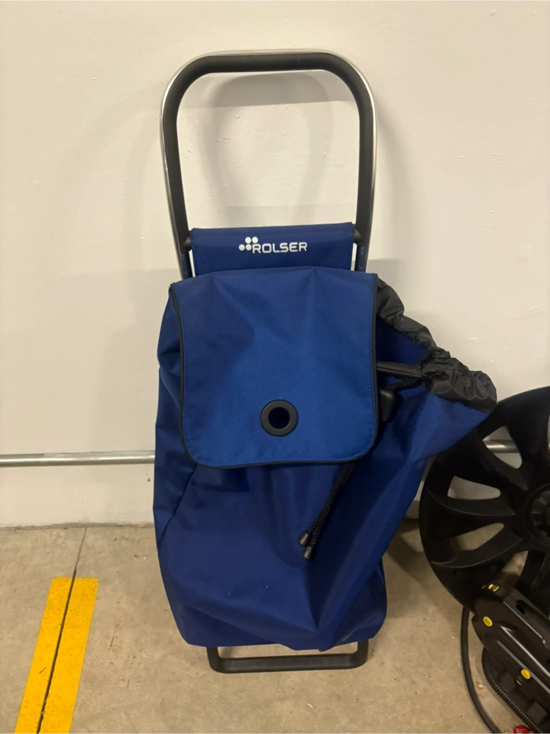 This is a blue Rolser shopping trolley. It features a durable fabric bag and a sturdy frame. Great for carrying groceries or other items from the store!