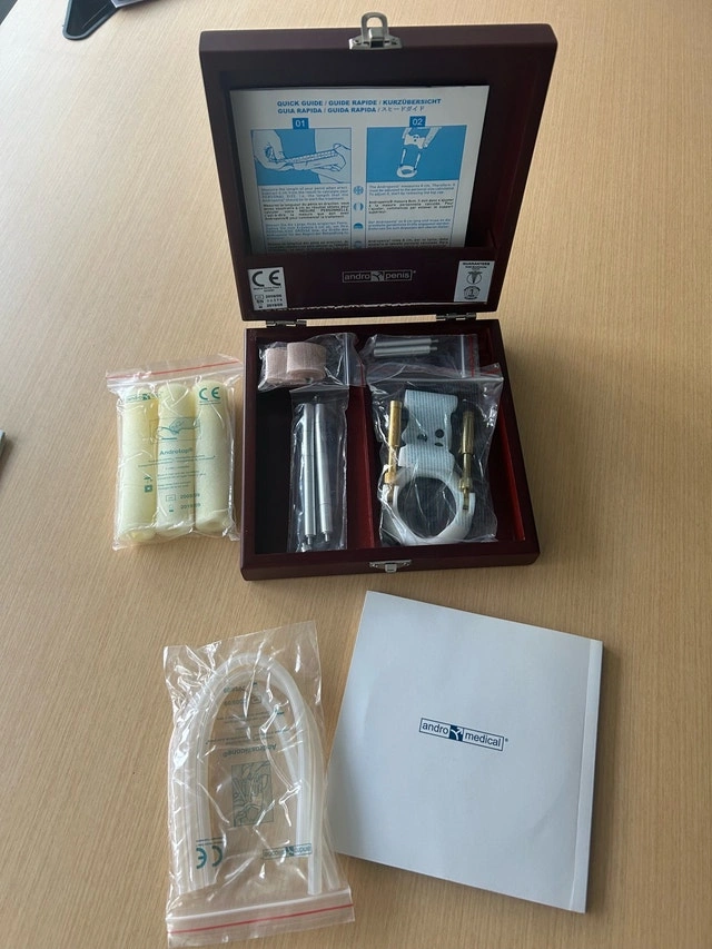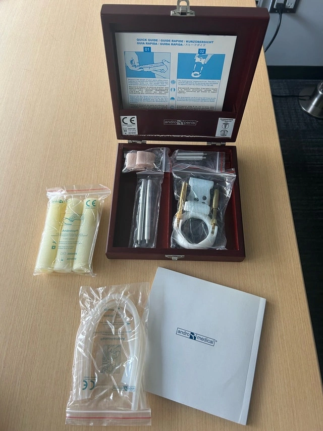 Complete AndroPenis / Andromedical traction extender kit in the original hard case. Everything shown in the photos is included (device, rods/components, comfort padding/sleeves, tubing, strap/bands, manuals + DVD). Items are still in their packaging. This is a men’s health/traction device (adult item). Pickup only in Mississauga (Erindale). Cash or e-transfer accepted. Due to the nature of the item, final sale.