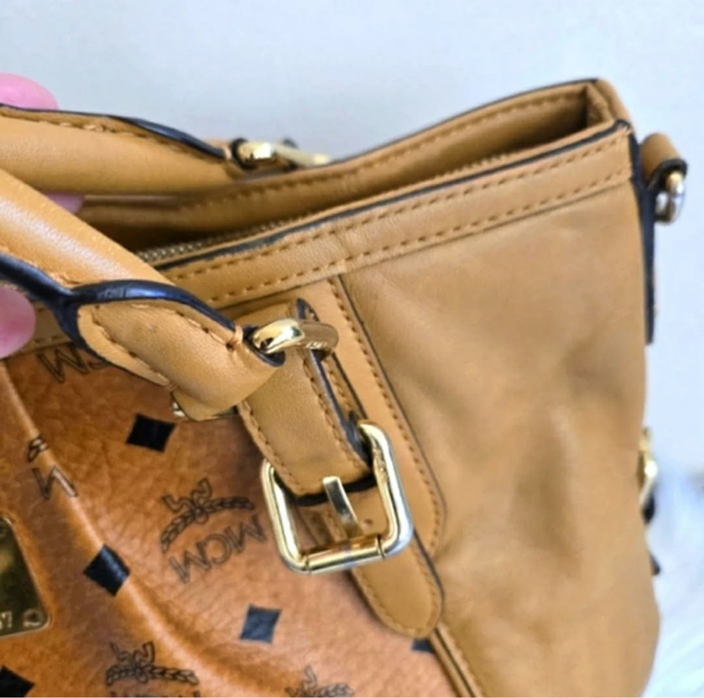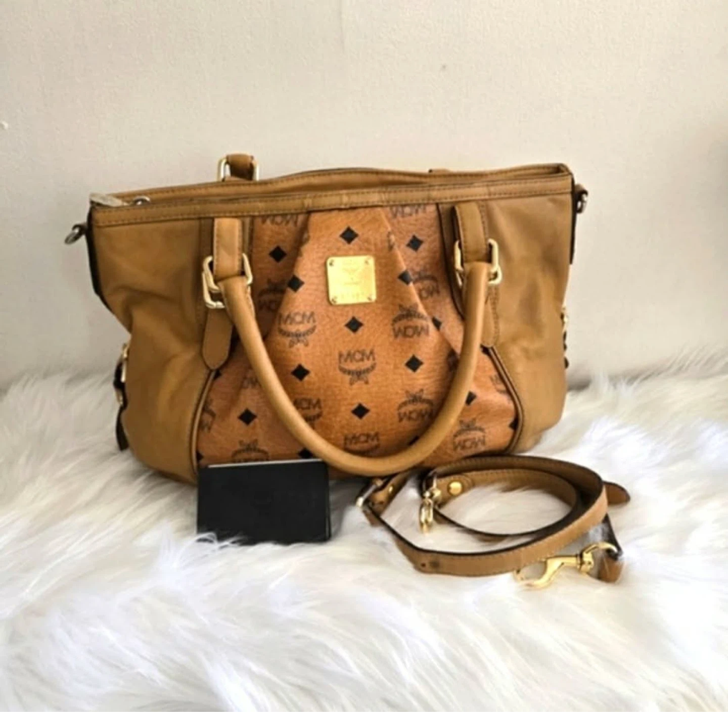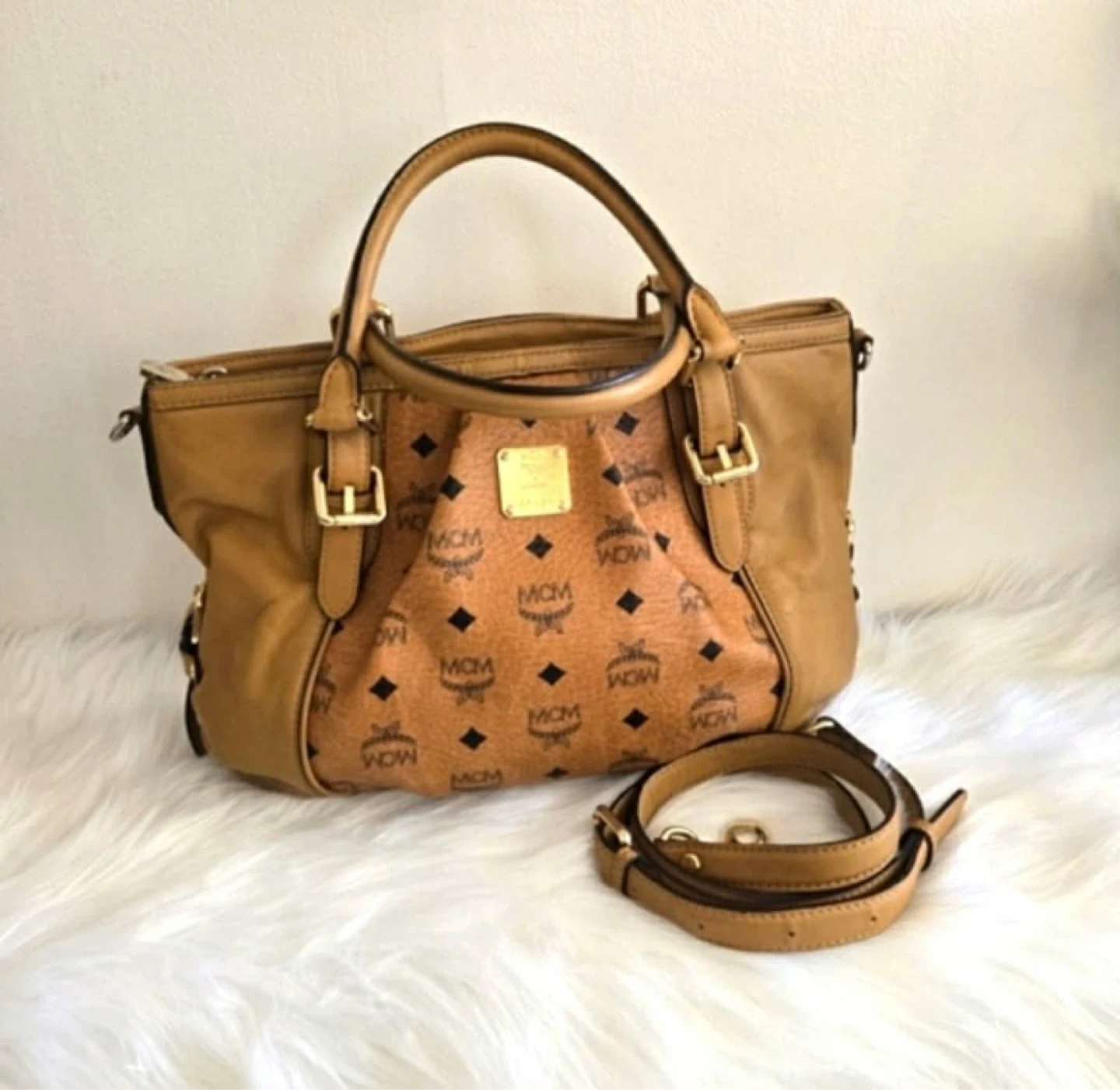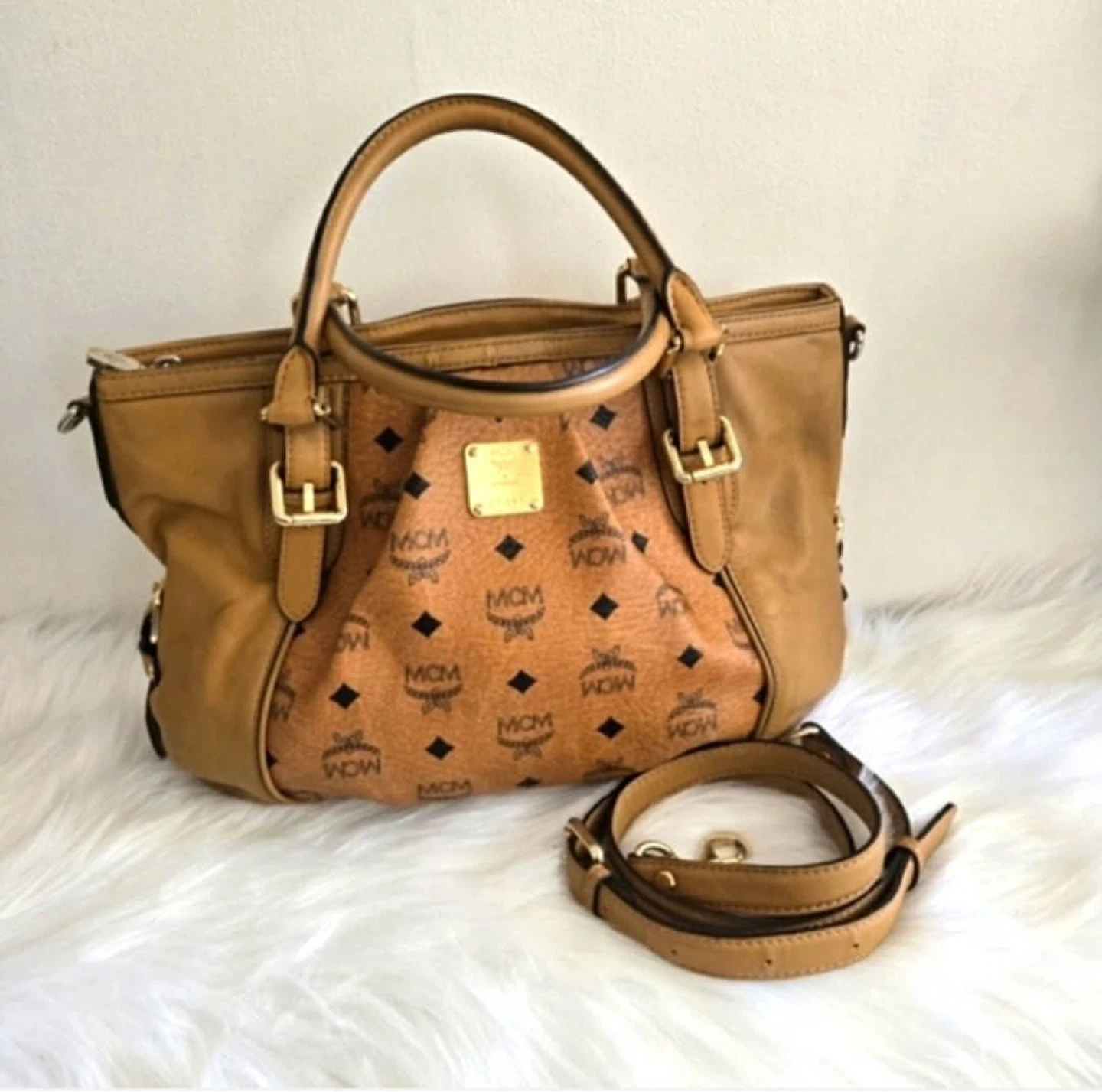 MCM tote bag in classic Visetos print. Leather trim and handles. Includes adjustable shoulder strap. Interior is lined with MCM logo pattern.