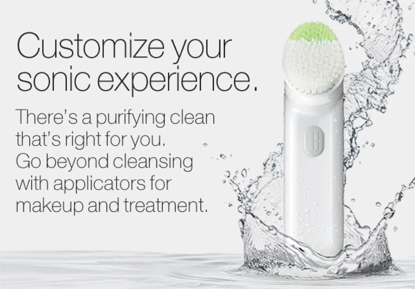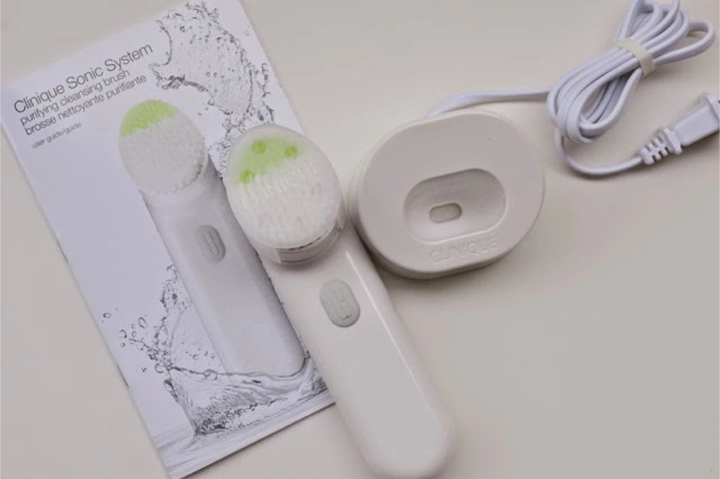 Clinique Sonic System purifying cleansing brush with its charging cradle and user guide. This sonic experience offers a purifying clean for your skin. It's designed to go beyond cleansing with applicators for makeup and treatment.
