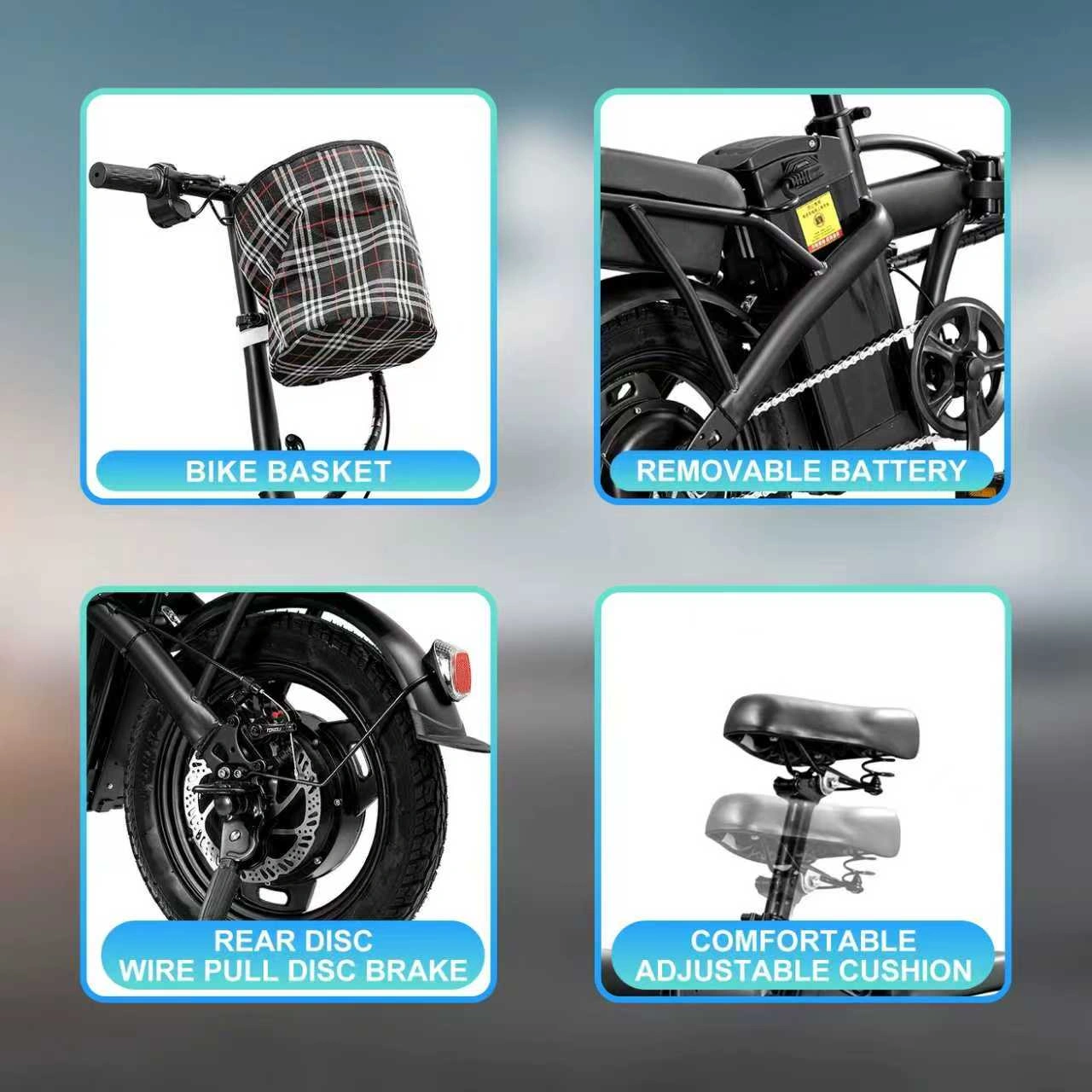 10Selling a foldable electric bike! It comes with a bike basket, a removable battery, and a comfortable adjustable cushion. It also features a rear disc wire pull disc brake. It can be folded in two simple steps and easily stored in your trunk! It has three riding modes: 100% electric mode, 50% assisted mode, and 0% fitness mode