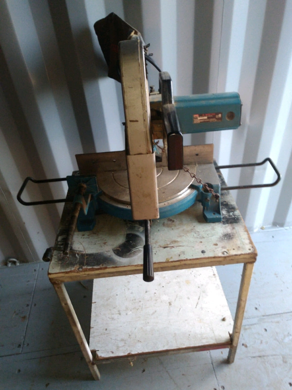 24Ryobi 14 inch compound saw with stand. This model features a 14-inch blade diameter that allows it to cut through larger materials easily and efficiently. Other special details include a two stage safety switch, a durable cast iron base and a quick release vice. Miter capacity of 45° left or right with positive stops at 0°; 15°; 22.5°; 30° and 45°. Two stage safety switch for increased operator safety. Extremely durable cast base for stability and stand. Quick release vice for fast repeat cut-offs. Call or text 705 440 9159