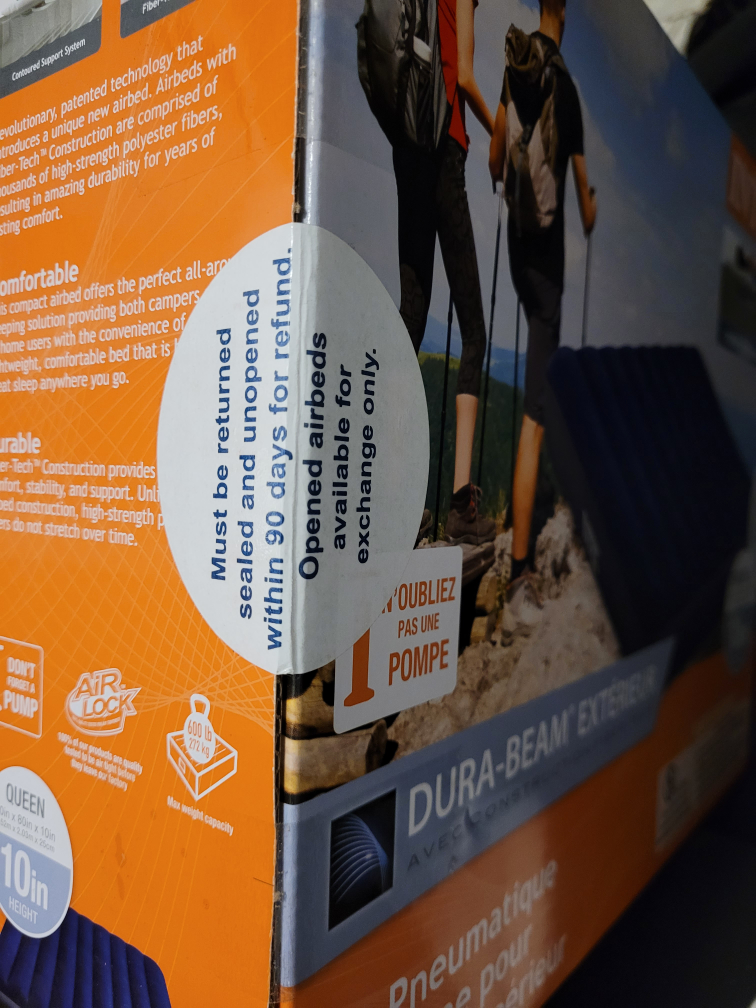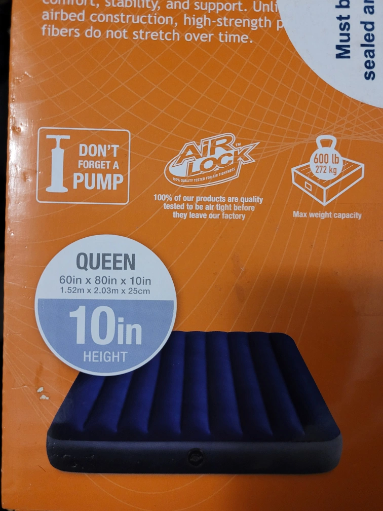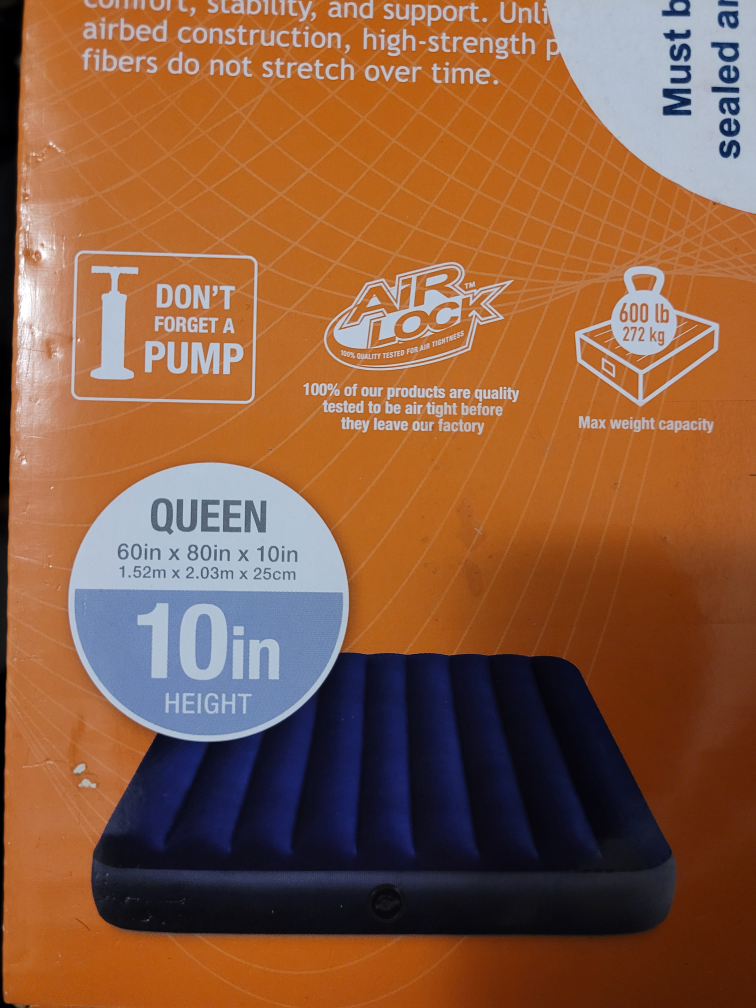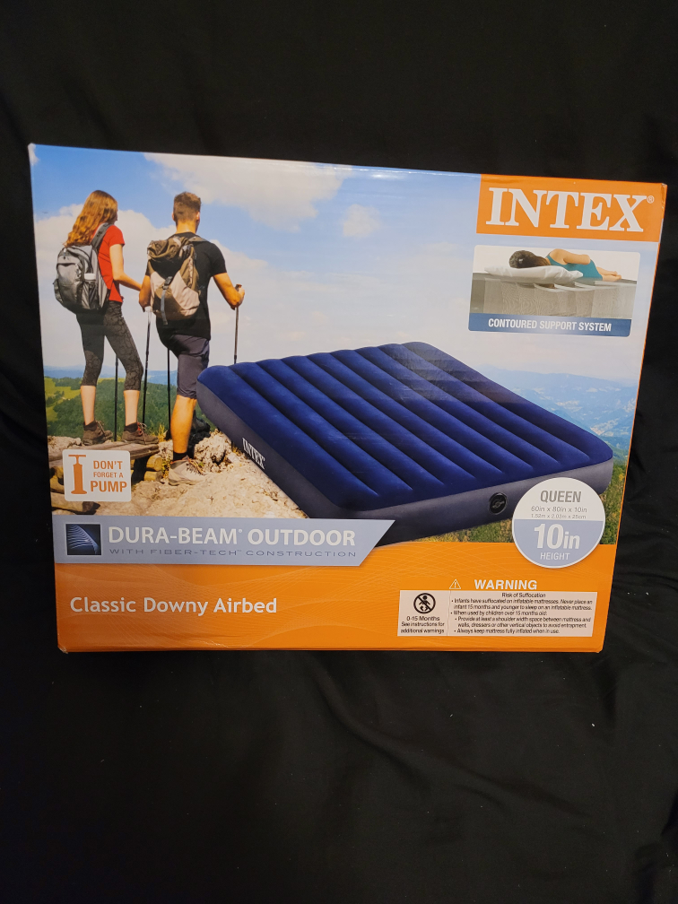 Campers looking for a good night sleep? Look no further... with This "Queen Size" INTEX Classic Downy Airbed. Can fit 2 Adult size people. INTEX's revolutionary, patented technology that introduces a unique new airbed. Airbeds with Fiber-Tech construction are comprised of thousands of high strength polyester fibers, resulting in amazing durability for years of lasting comfort. Brand New never been open with the seal stickers. Queen size Air mattress, pump not included. Cash only please.