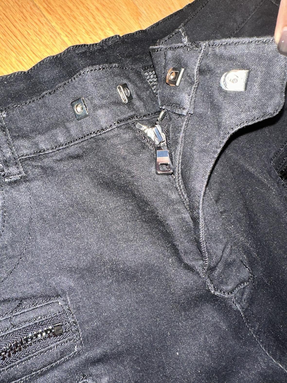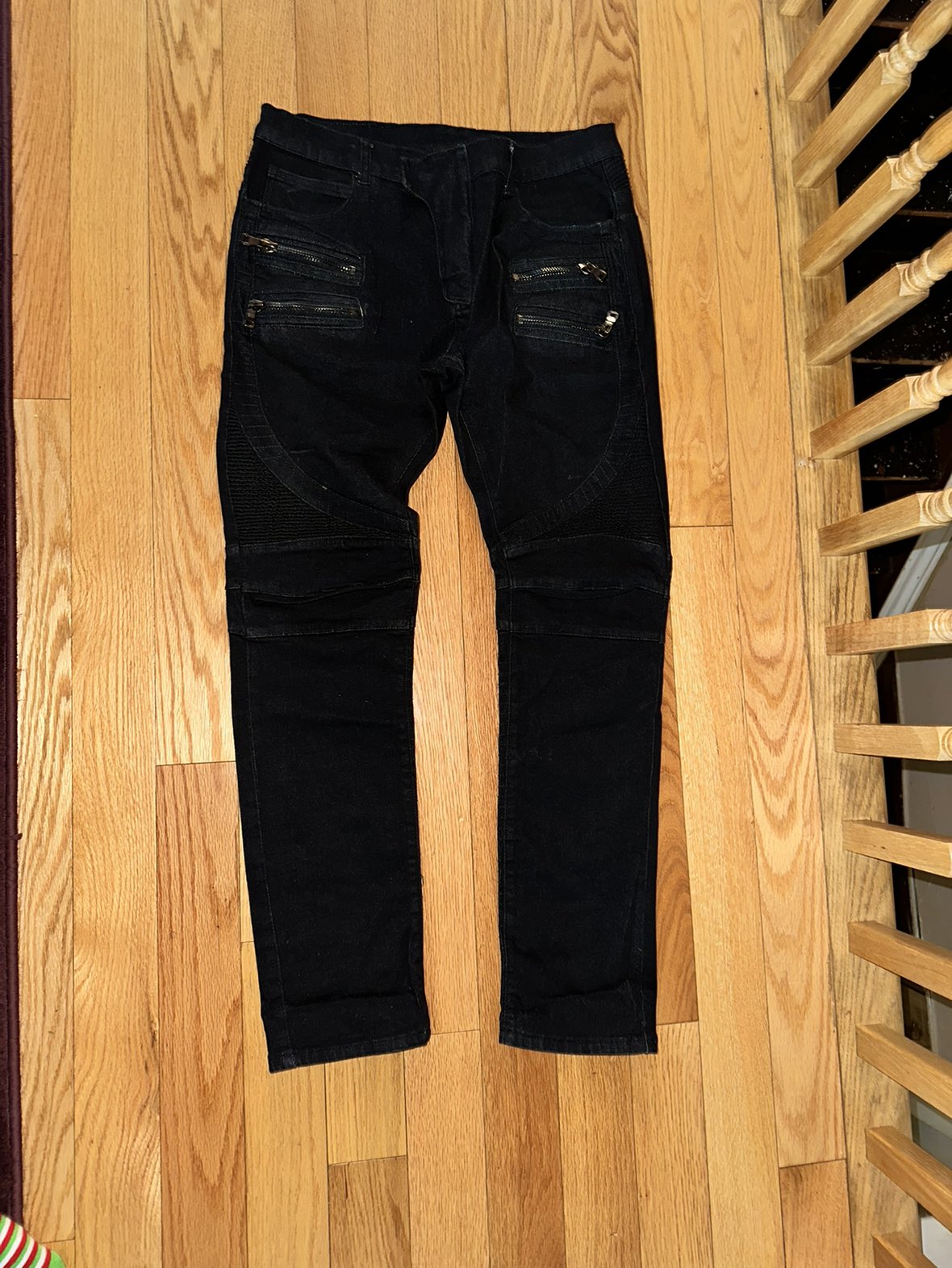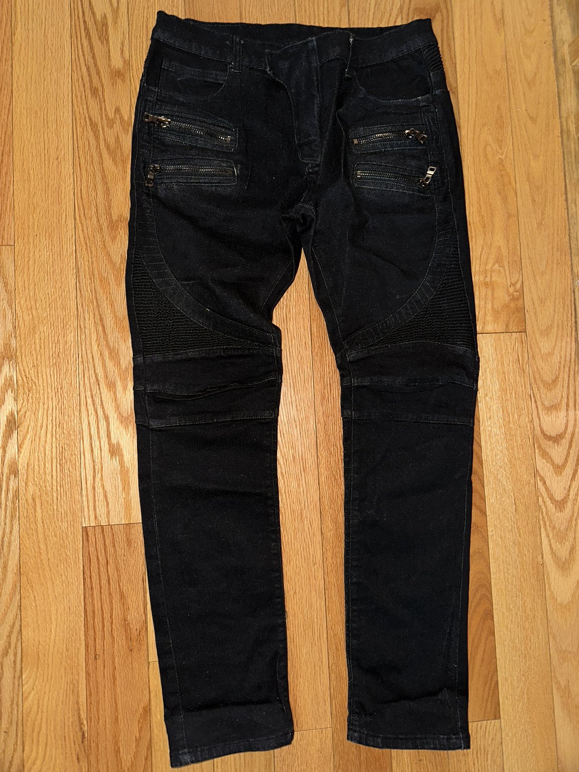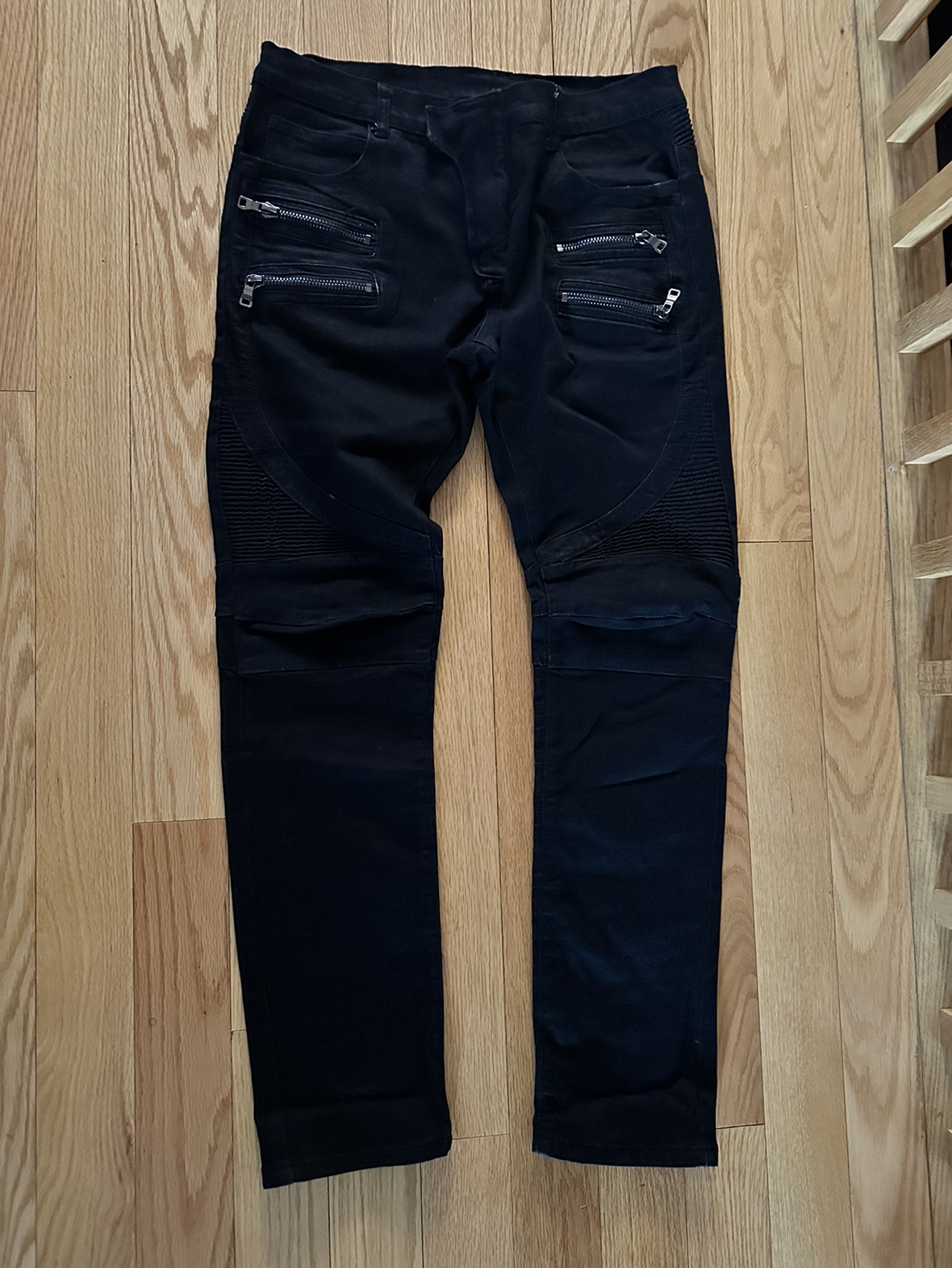 Balmain moto biker denim jeans dark black 4 zipper Auth black Balmain jeans for men Waist size 33 Any flaws are pictured, these are in very good condition They seem straight leg not too skinny Made in Italy