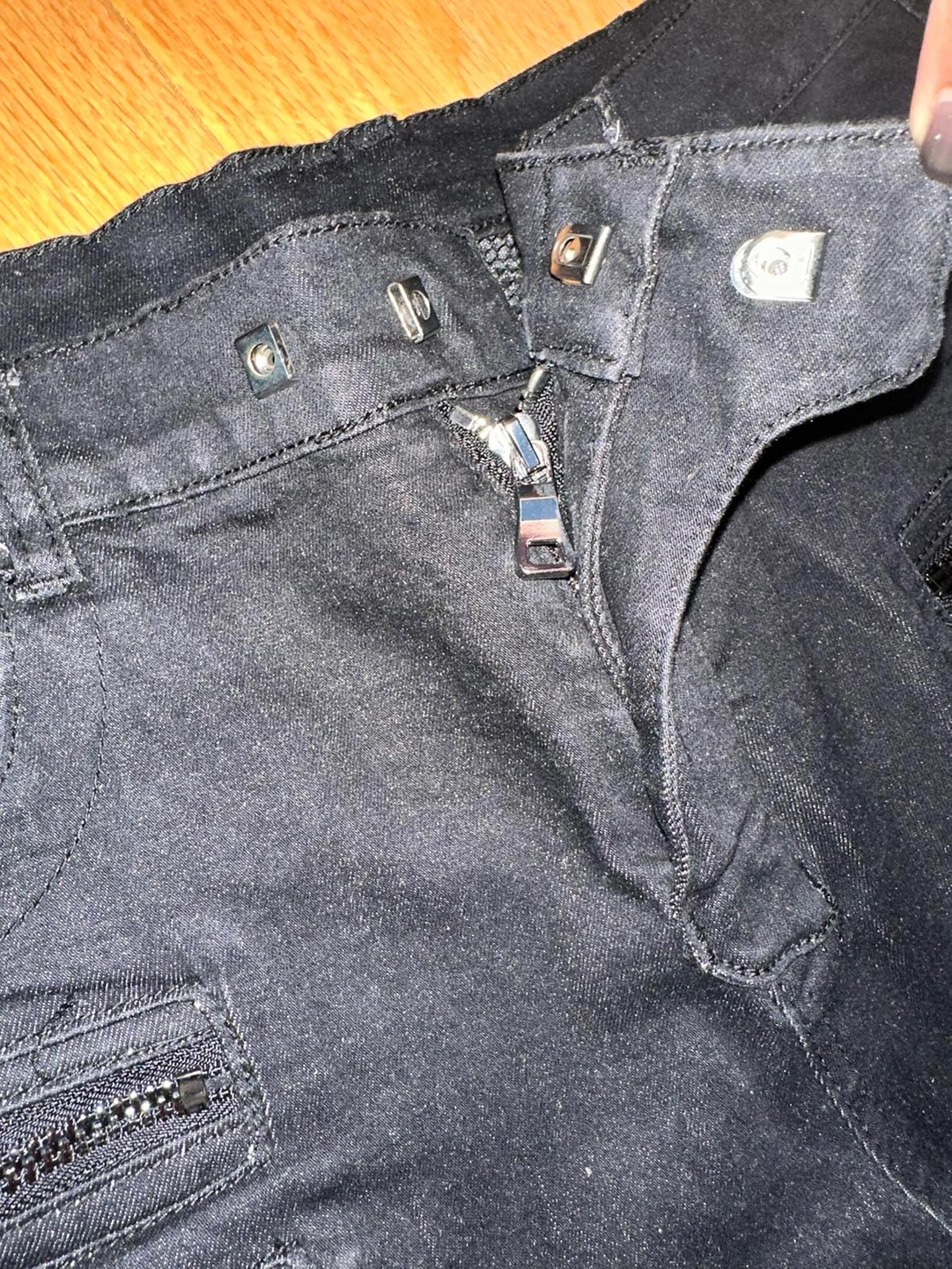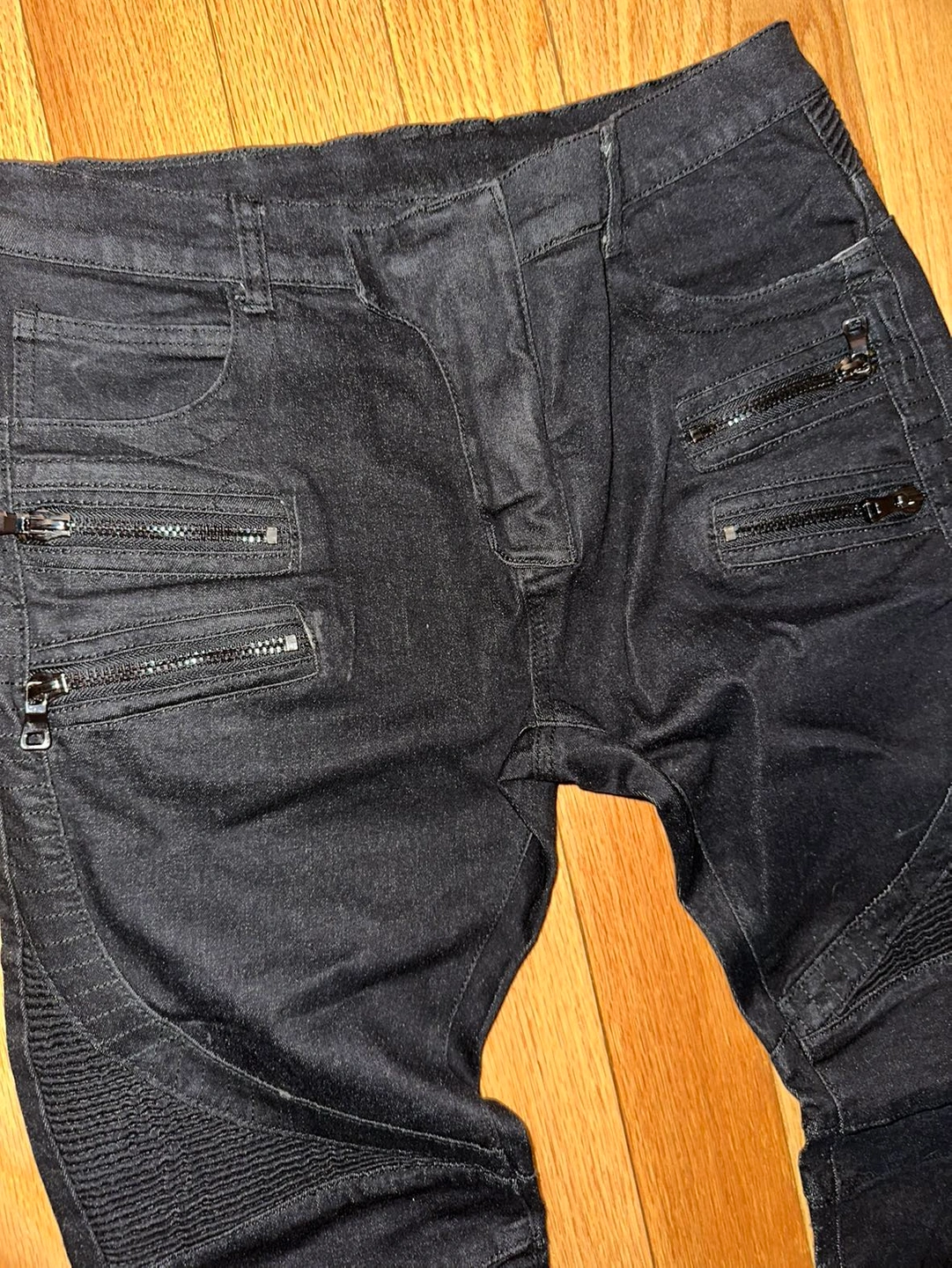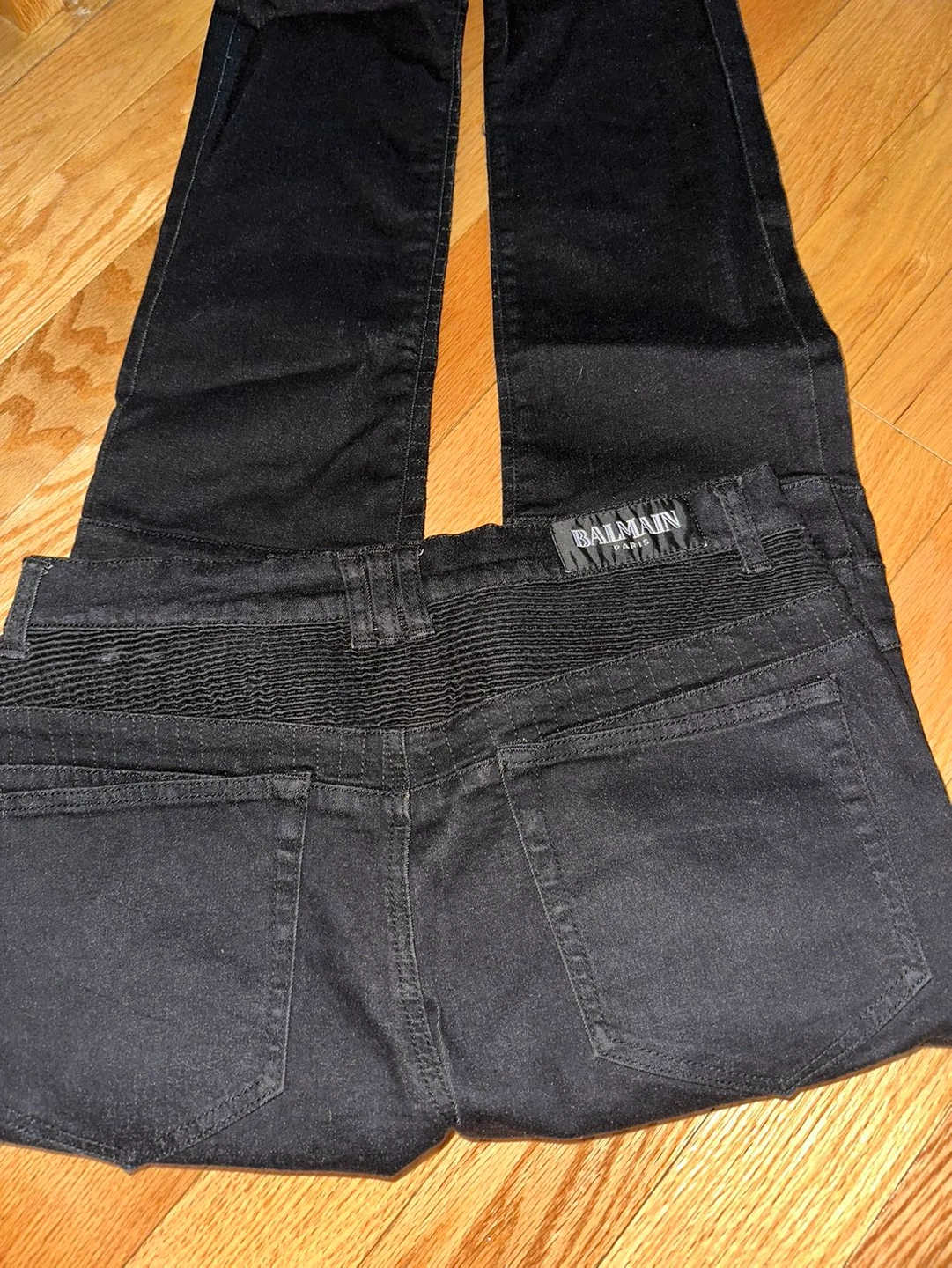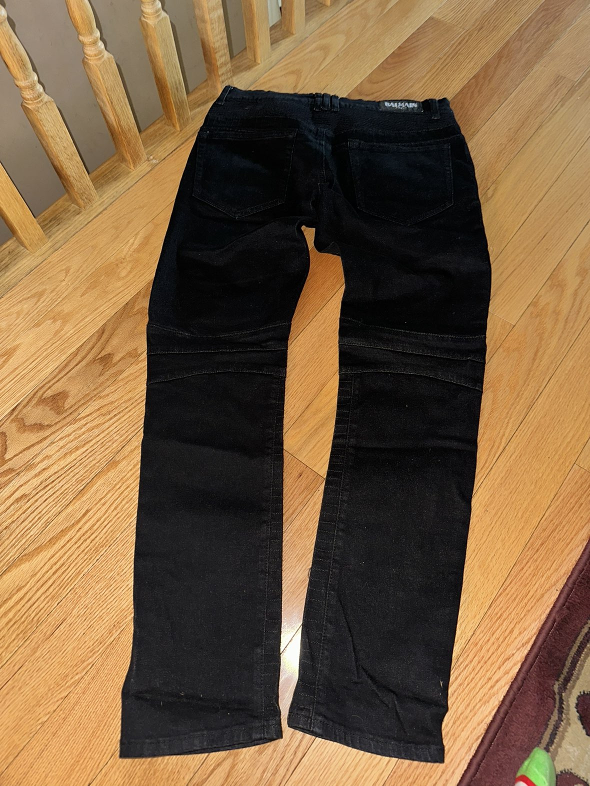 Balmain moto biker denim jeans dark black 4 zipper Auth black Balmain jeans for men Waist size 33 Any flaws are pictured, these are in very good condition They seem straight leg not too skinny Made in Italy