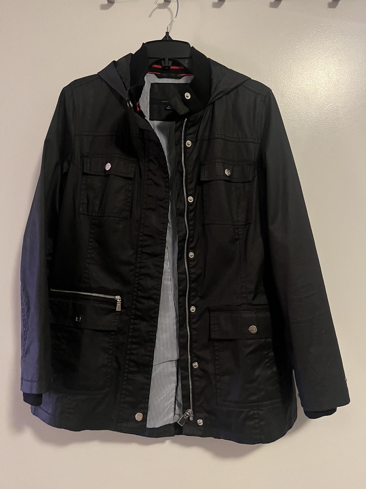 Tommy Hilfiger Jacket Black Women’s M Have worn this in drizzles before and it seems water repellant. A few years old but in great condition!