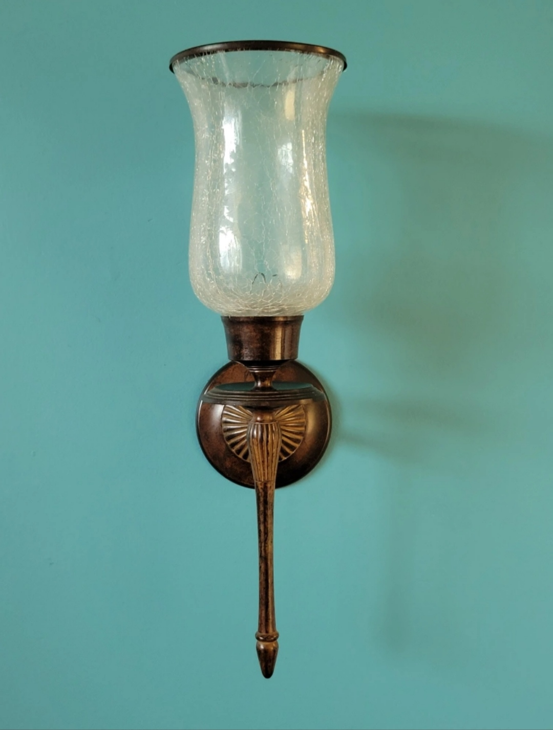 A beautiful unique vintage looking pair of Sconces. Easy installation and great look! I have never lit a candle inside it before so it's perfectly clean and new! Maybe the right thing for your home?