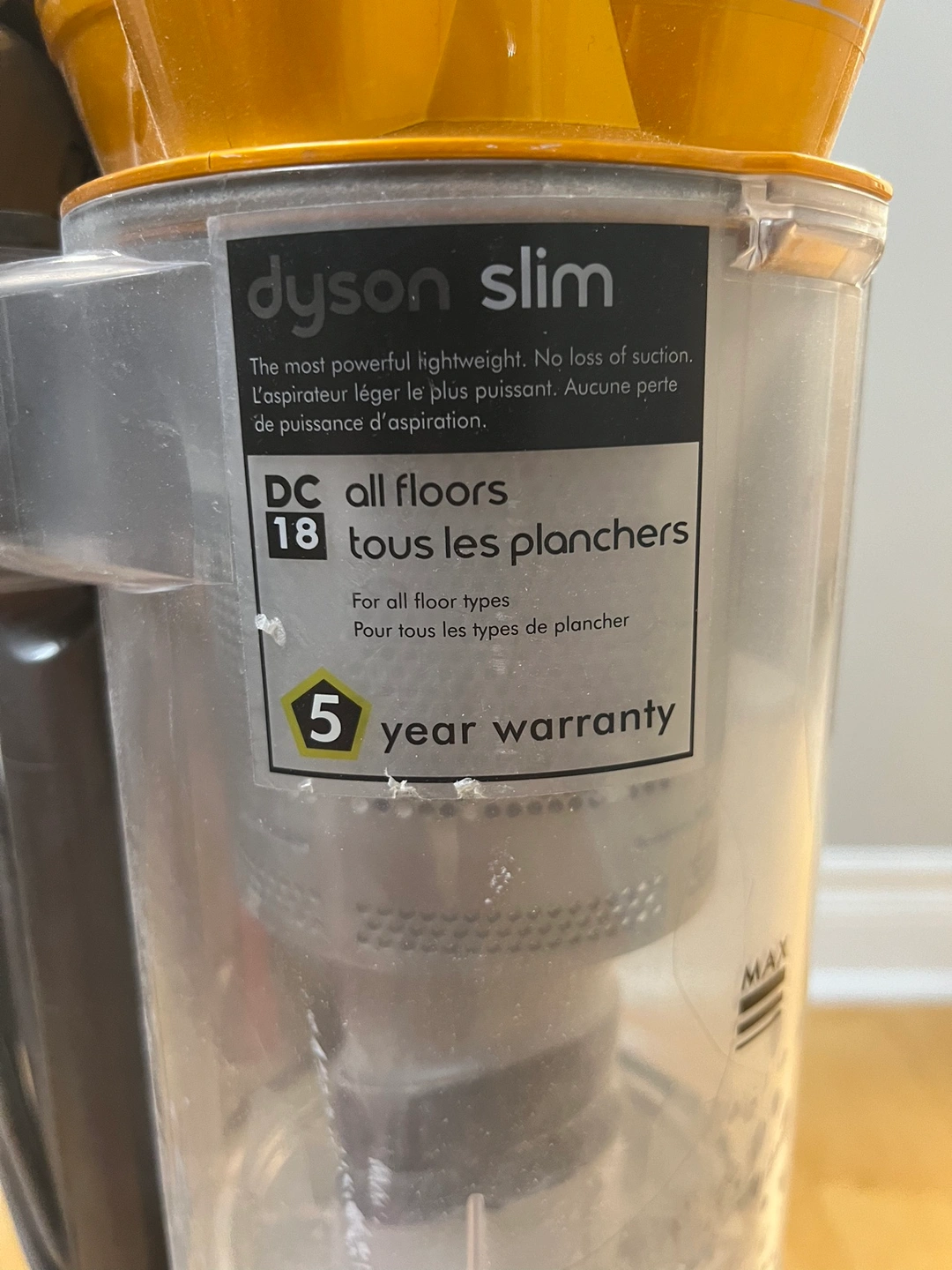 Used Dyson vacuum that still works perfectly for hardwood and carpeted floors. We got a handheld one so selling this big one. Comes with 2 accessories as well as car cleaning kit.