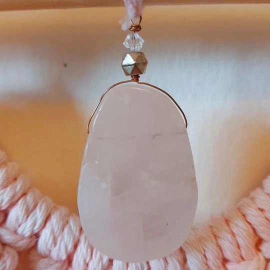 This handmade macrame wall hanging is hand dyed pink and hangs on a birch rod. Makes a lovely addition to any room that needs a touch of pink to your décor! Hanging is accompanied by a Rose Quartz crystal topped with a small Swarovski crystal.